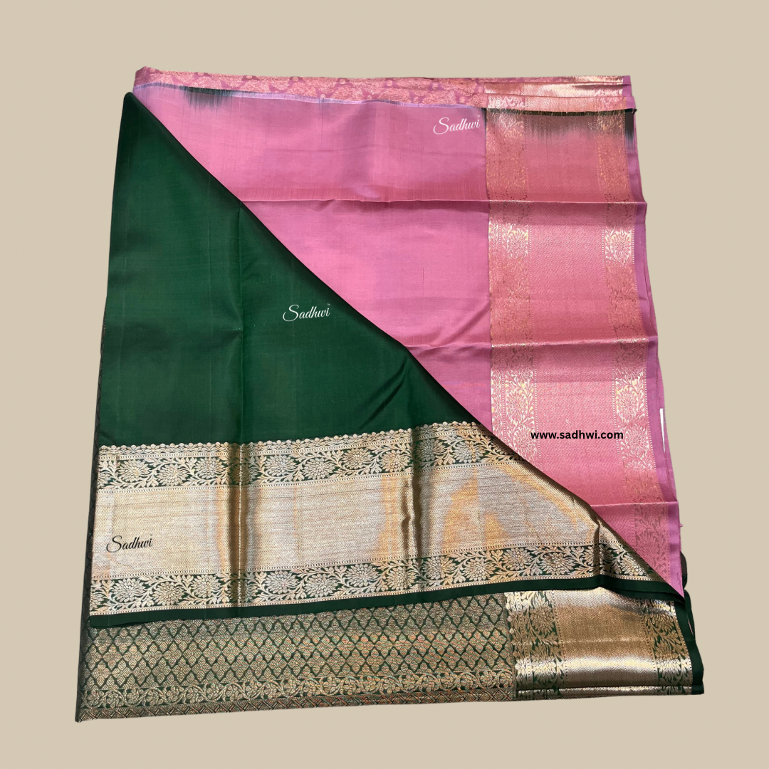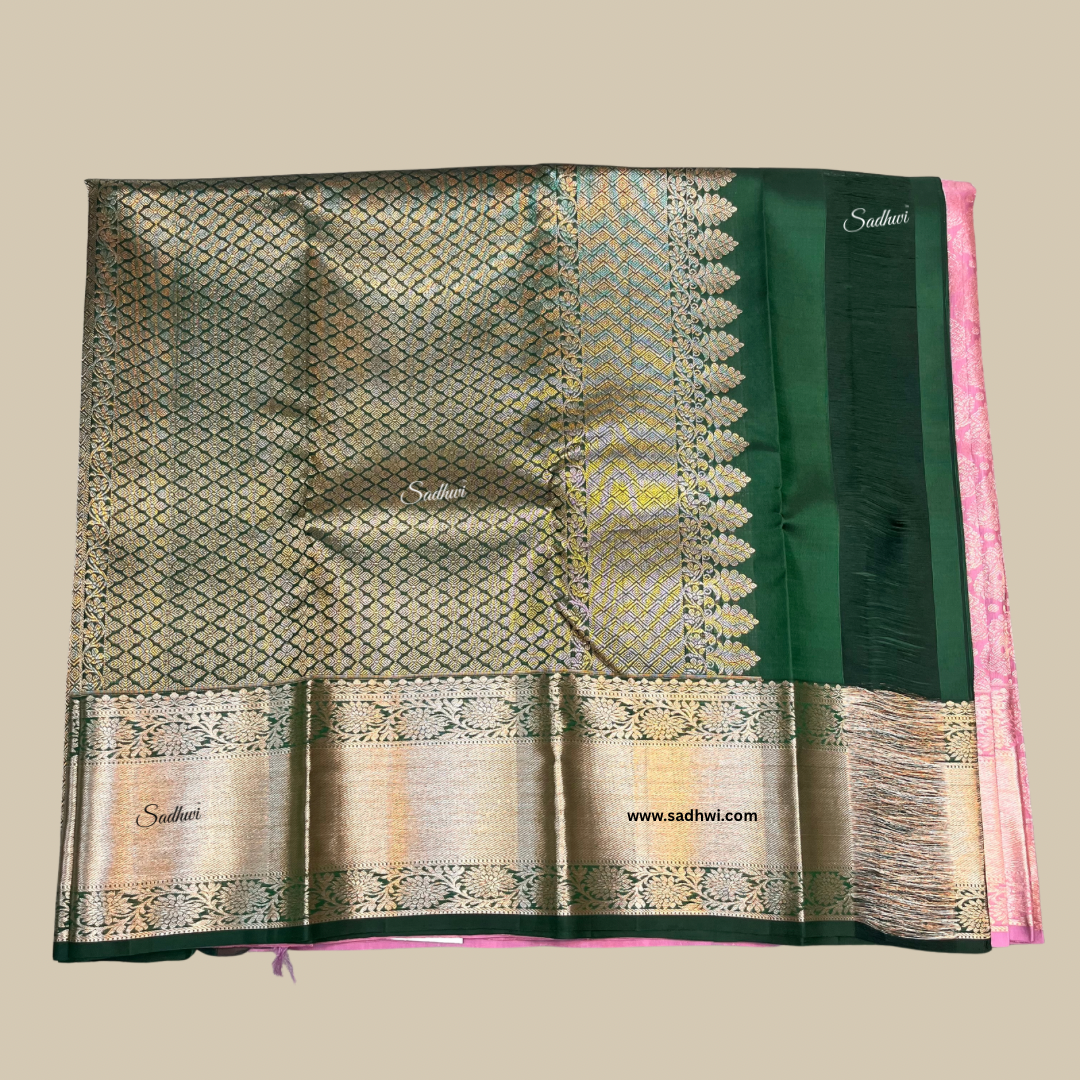 Step into a world of elegance with this ethereal Baby Pink and Bottle Green Pure Kanchipuram Silk Saree, a poetic blend of softness and tradition. The gentle baby pink silk body radiates delicate charm, enhanced with shimmering gold zari buttas that add a touch of festive brilliance. In striking contrast, the rich bottle green border and pallu are adorned with intricate motifs — from traditional paisleys to temple patterns — woven using the age-old korvai technique. This interplay of pastel grace and deep opulence creates a captivating visual balance, perfect for weddings, engagements, and spiritual celebrations. The luxurious drape offers both structure and softness, reflecting the superior quality of authentic Kanchipuram silk. Every thread in this saree whispers stories of heritage, craftsmanship, and timeless beauty. Paired with an unstitched blouse in bottle green, the ensemble speaks of quiet grandeur. Wear this masterpiece and embody elegance wrapped in silk and culture.