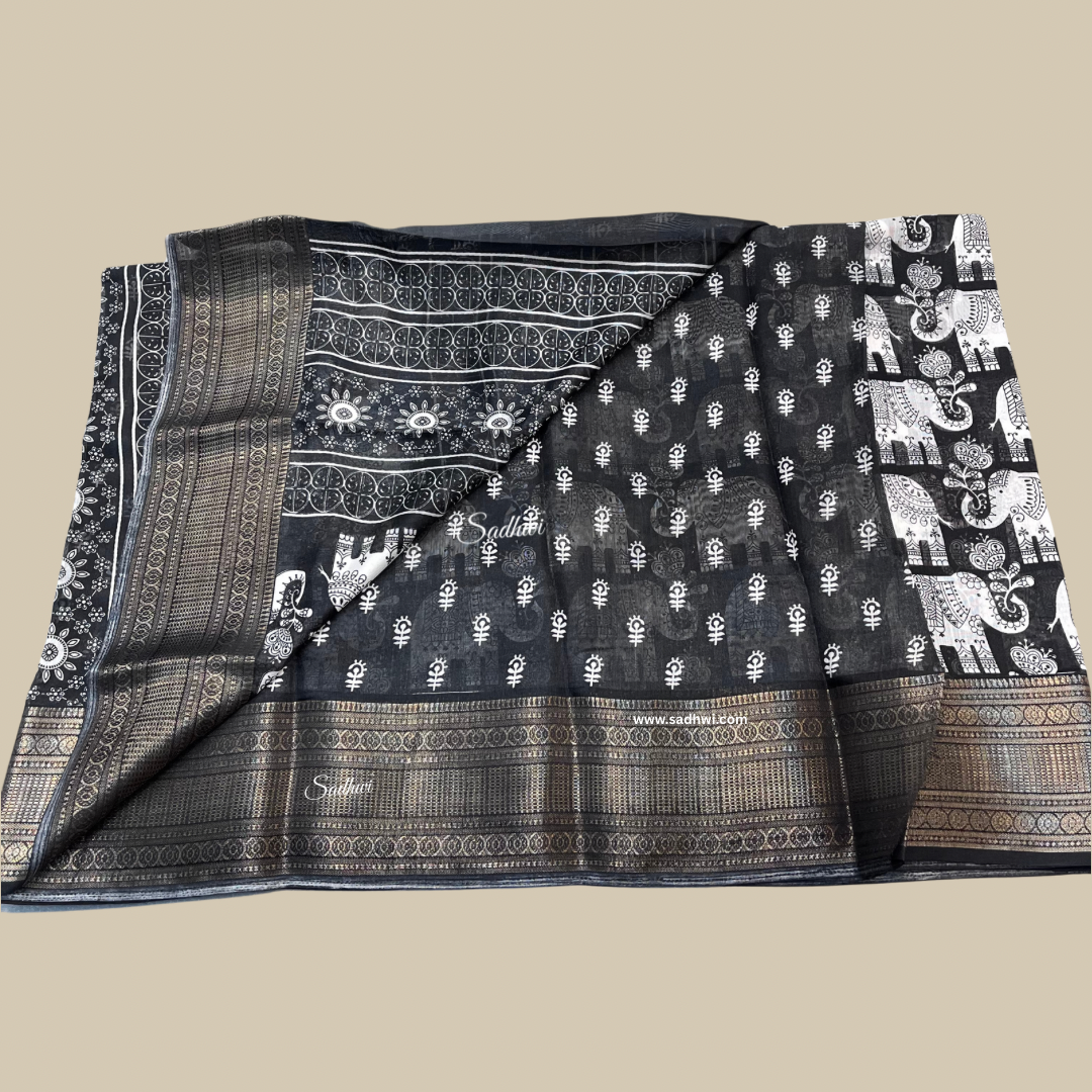 This striking black cotton saree is adorned with intricate elephant prints, celebrating traditional motifs with a bold, artistic flair. The monochrome palette adds a touch of sophistication, while the detailed elephant patterns lend it a sense of cultural richness and heritage. Crafted from soft, breathable cotton, it promises comfort without compromising on style, making it ideal for everyday wear, cultural events, or casual outings. Timeless yet distinctive, this saree is a beautiful fusion of simplicity and tradition.
