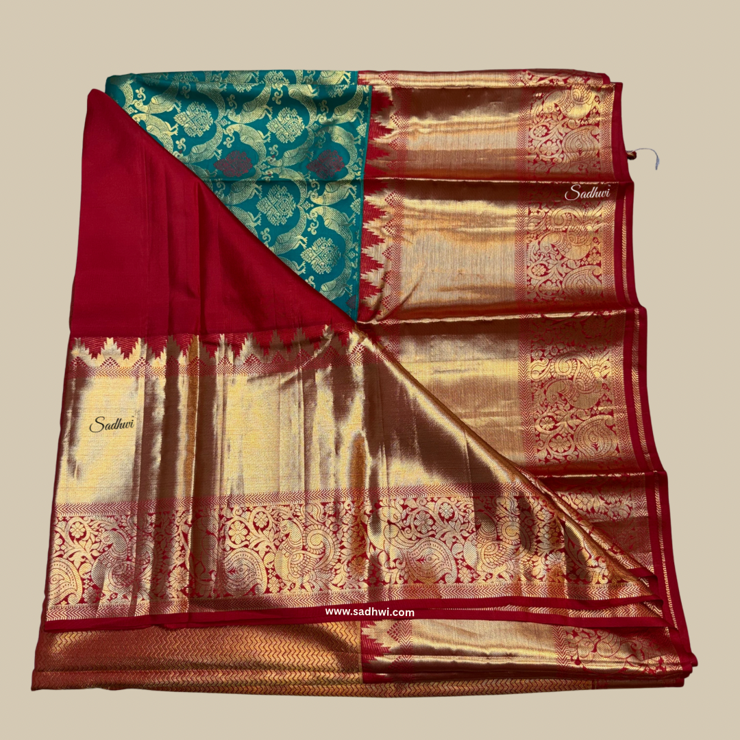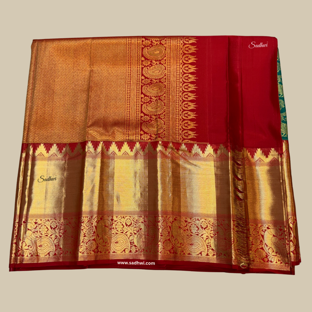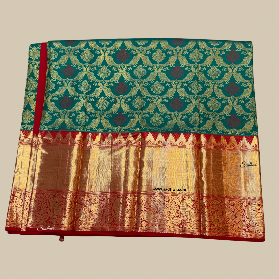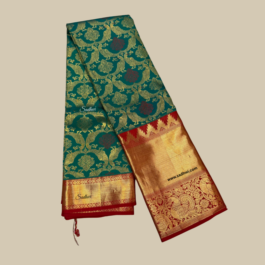 Step into the realm of royal elegance with this Bottle Green with Dark Red Traditional Pure Kanchipuram Silk Saree, a breathtaking handwoven treasure that celebrates the rich legacy of South Indian craftsmanship. Meticulously crafted from the finest mulberry silk, this saree radiates a regal charm that effortlessly blends tradition with sophistication. The deep bottle green body, symbolic of prosperity and grace, forms a stunning contrast against the opulent dark red border and pallu, intricately adorned with pure gold zari motifs inspired by ancient temple architecture, floral vines, and peacock patterns. Each motif is woven with precision, reflecting the divine artistry and cultural grandeur synonymous with Kanchipuram weaves. The fabric’s luxurious texture and natural sheen give it an ethereal allure, while the heavy zari border lends a majestic finish, making it a perfect choice for weddings, festive celebrations, and grand occasions. The pallu glimmers with elaborate zari detailing, adding a touch of heritage opulence that flows like poetry with every drape. Enriched with timeless charm and divine elegance, this saree is a masterpiece meant for the modern woman who cherishes tradition yet shines with individuality. Pair it with antique gold jewelry and a bold bindi for an ensemble that radiates confidence, beauty, and regal sophistication. This Pure Kanchipuram Silk Saree is not merely a piece of attire — it is an heirloom of artistry, woven with devotion and destined to be cherished for generations.