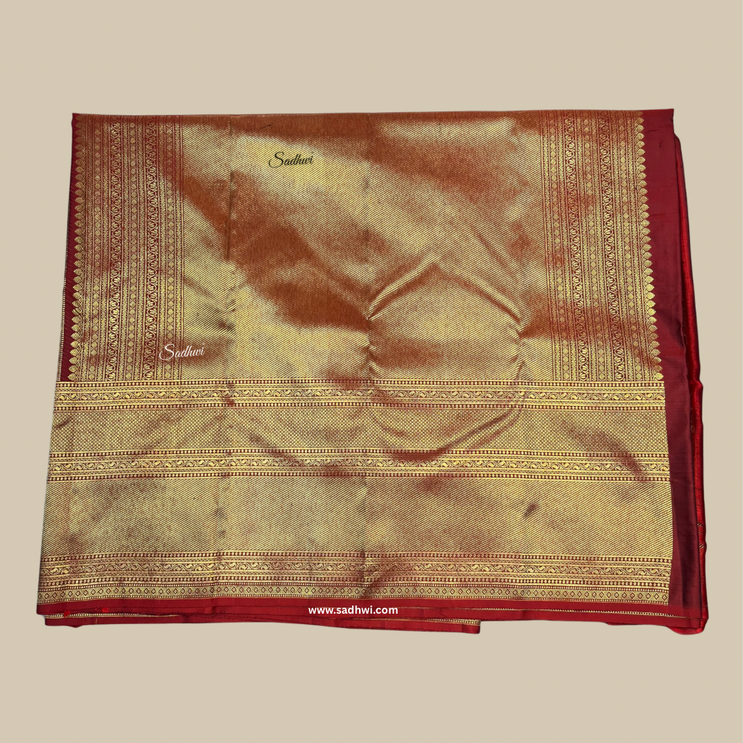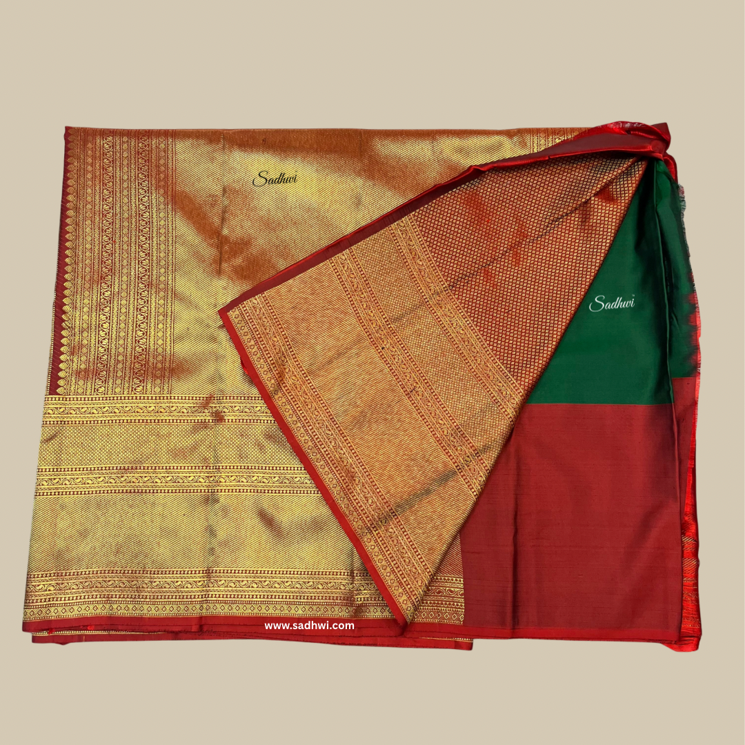 Step into timeless grandeur with this Bottle Green with Red Brocade Pure Kanchipuram Silk Saree, a stunning blend of heritage hues and exquisite craftsmanship. The deep bottle green body, woven from pure mulberry silk, radiates sophistication and depth, making it perfect for regal occasions. Adorned with subtle gold zari buttas, the saree carries an understated charm that allows its luxurious fabric to shine. The highlight is its vibrant red brocade border and pallu, richly woven with intricate zari patterns—florals, paisleys, or traditional checks—that reflect the mastery of Kanchipuram weavers. The contrast creates a bold yet classic statement, ideal for weddings, festivals, and grand celebrations. The pallu unfolds like a tapestry of tradition, drenched in detailed gold zari work. Paired with an unstitched red brocade blouse piece, this saree completes a look that is both regal and rooted in tradition. It’s not just a saree—it’s a legacy woven in silk.