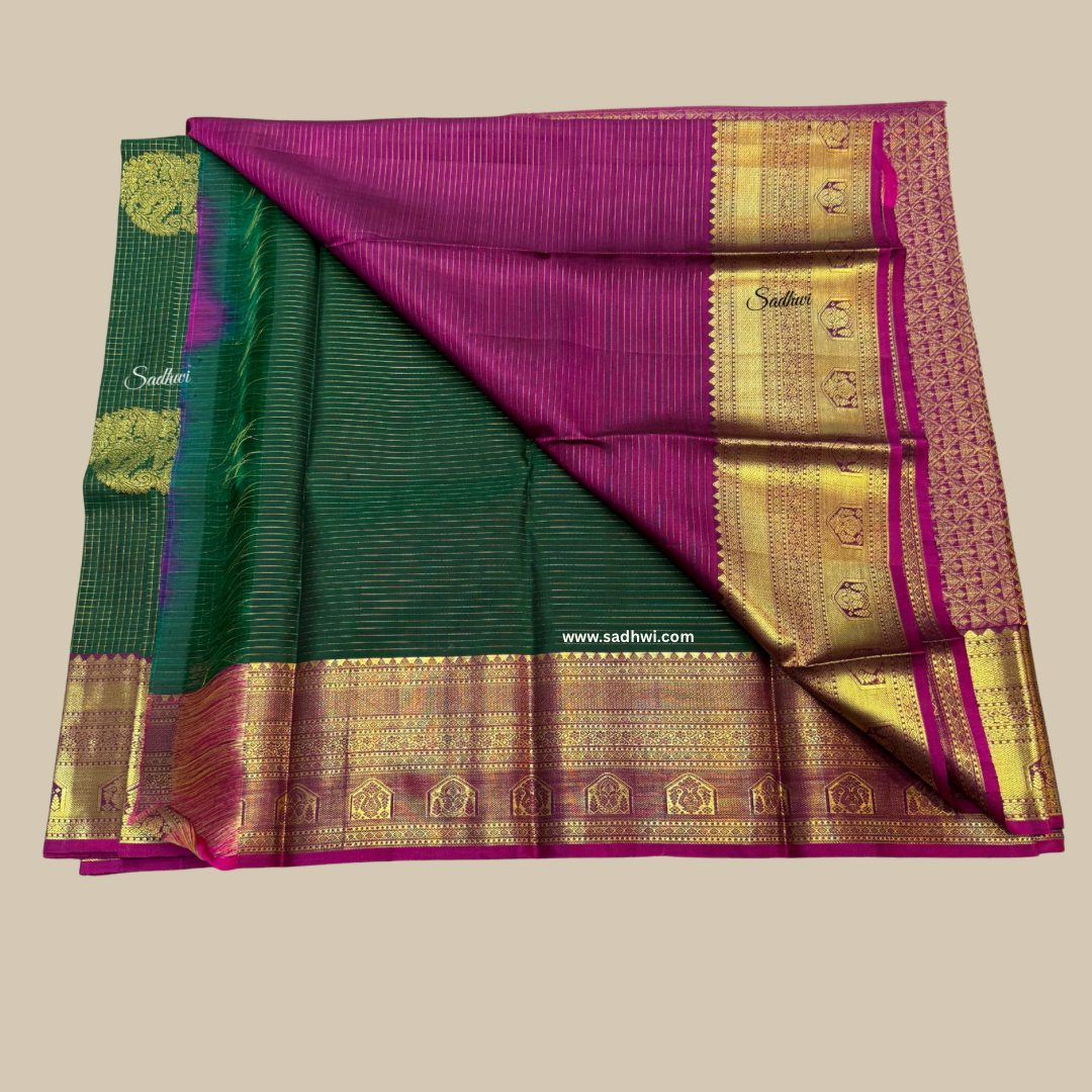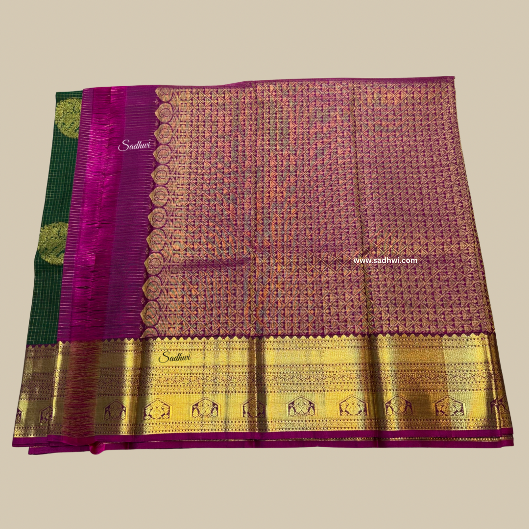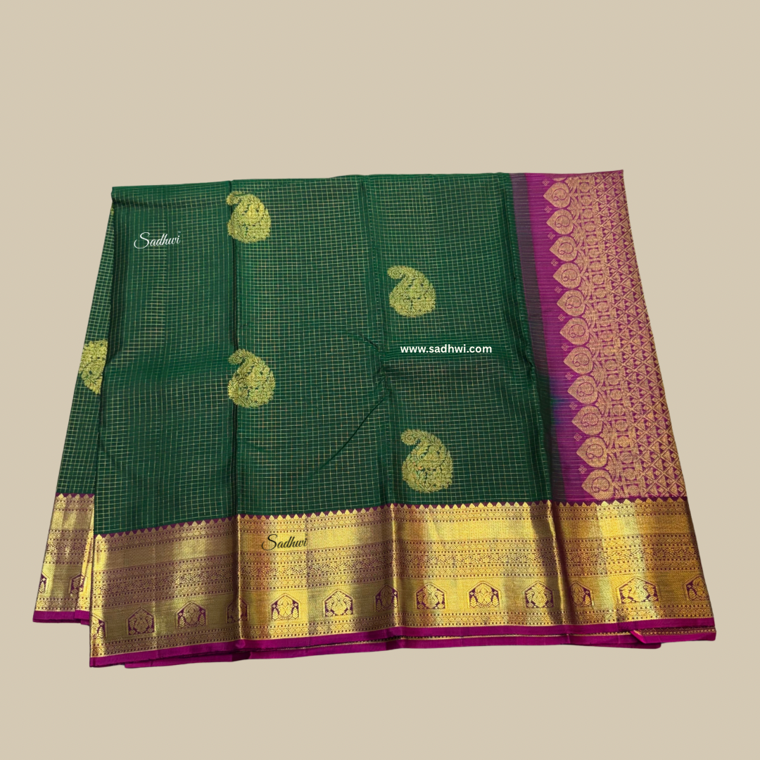 Immerse yourself in the timeless elegance of this Bottle Green with Wine Checks Pure Traditional Kanchipuram Silk Saree, where heritage meets grandeur in every weave. The deep, lustrous bottle green body is adorned with subtle wine-hued checks, creating a classic yet contemporary aesthetic. Crafted from the finest pure silk, this handwoven masterpiece reflects the rich legacy of Kanchipuram artisans. The wine contrast border and pallu, woven with intricate gold zari motifs, exude regal charm and cultural richness. Each thread speaks of age-old craftsmanship, blending tradition with sophistication. Perfect for weddings, festivals, and ceremonial occasions, this saree is a statement of poise and pride. The smooth silk drapes with a graceful fall, enhancing your silhouette with understated luxury. Paired with a coordinated blouse, it completes a look that is both dignified and dazzling. This saree is not just a garment—it is a celebration of tradition woven in silk. Own a piece of art that transcends time.