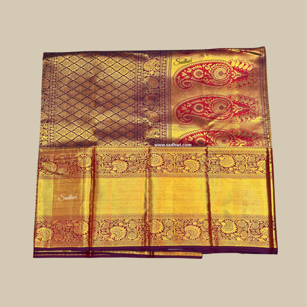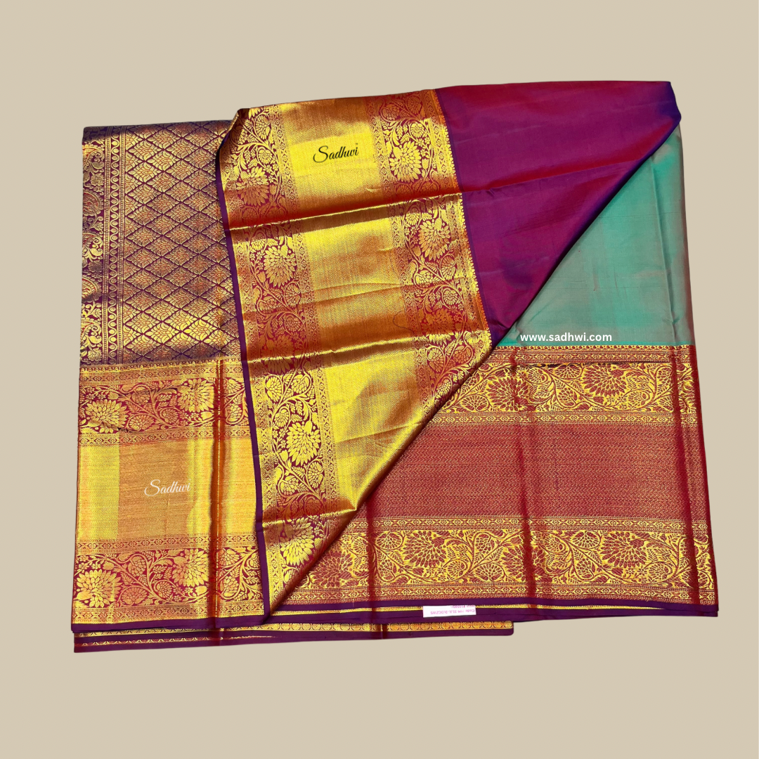 Brick Maroon with Cyan Green Pure Kanchipuram Silk Saree