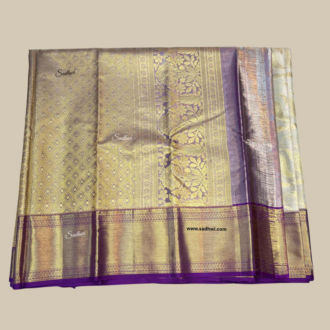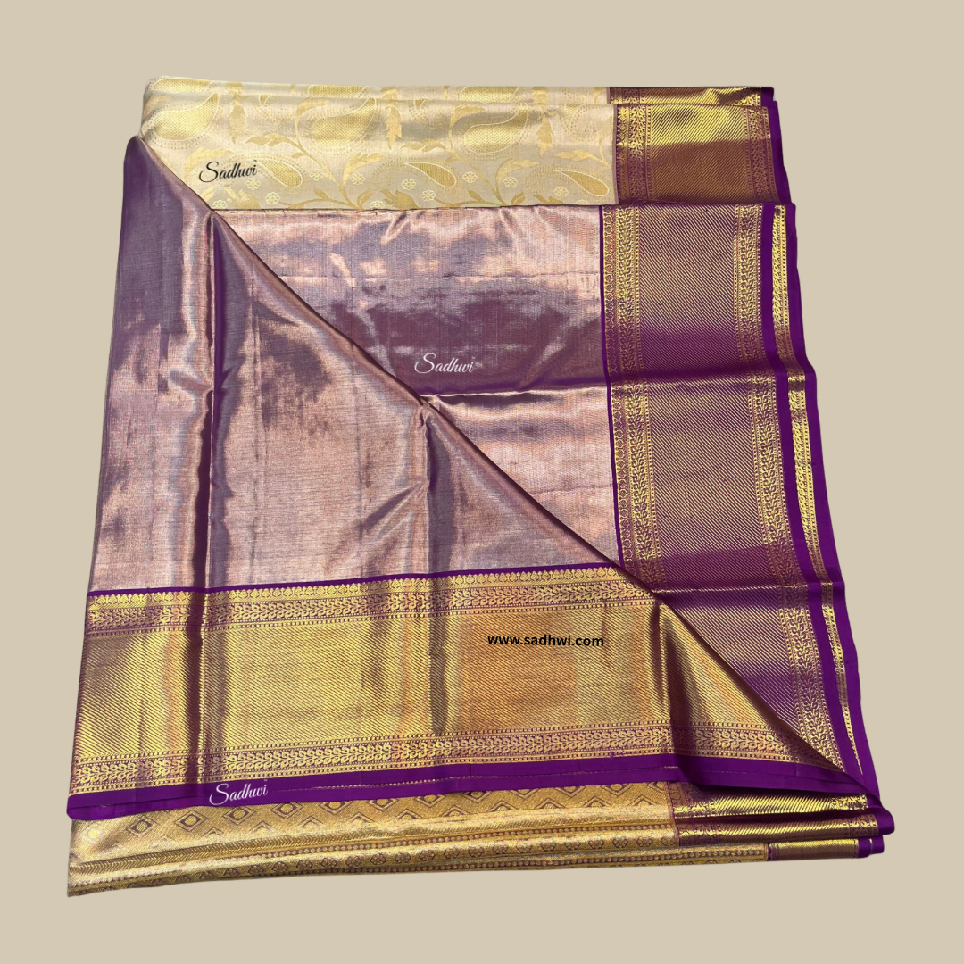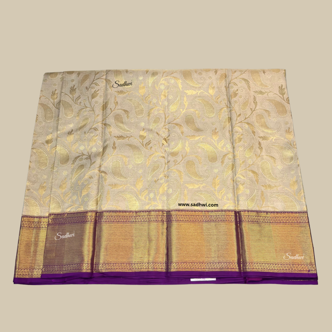Indulge in regal sophistication with our Cashew Cream with Purple Pure Traditional Kanchipuram Silk Saree, a stunning expression of grace and grandeur. The soft cashew cream body exudes subtle luxury, while the rich purple border and pallu create a striking contrast that commands attention. Handwoven from the finest pure silk, this saree reflects the unparalleled craftsmanship of Kanchipuram’s master weavers. Adorned with intricate gold zari motifs, each detail captures the essence of timeless tradition. The opulent purple pallu shimmers with elaborate patterns, adding depth and drama to the elegant cream canvas. Perfect for weddings, traditional festivities, and milestone celebrations, this saree drapes with majestic fluidity and enduring charm. The included matching blouse piece completes the ensemble with refined balance. Radiating poise and heritage, this piece is not merely attire—it’s a legacy in silk. Let your presence glow with heritage, harmony, and heirloom elegance.