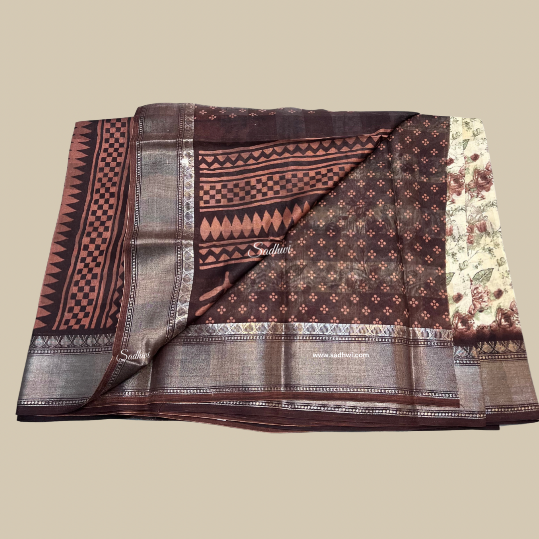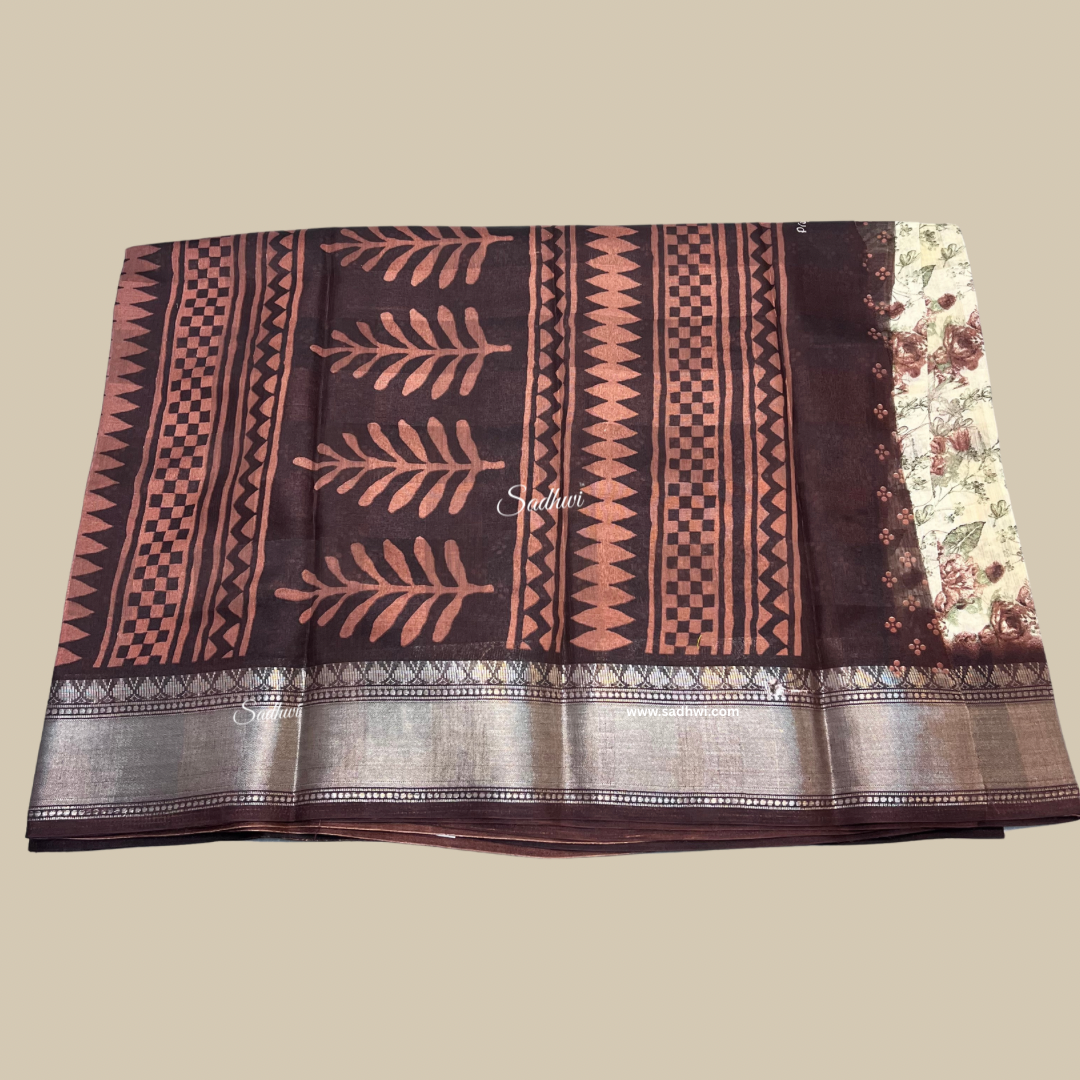 Cream With Brown Border Printed Cotton Saree
