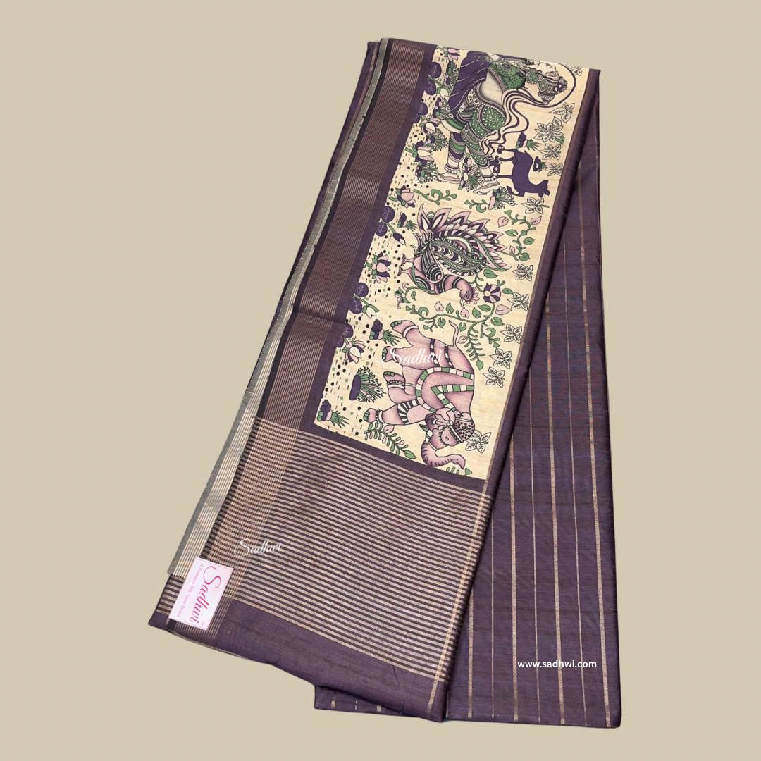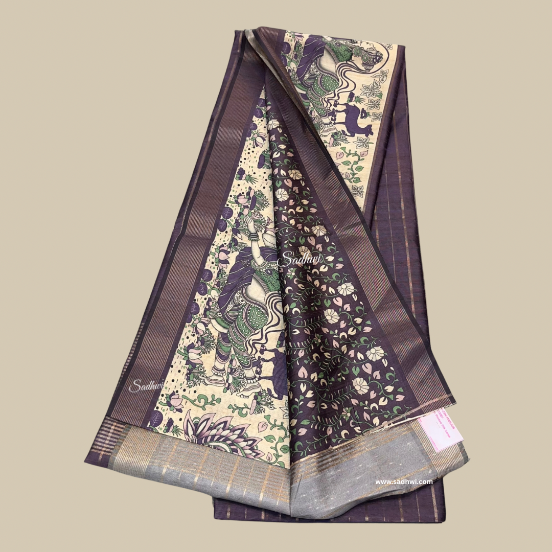 Deep Violet with Printed Kalamkari Border Tussar Silk Saree