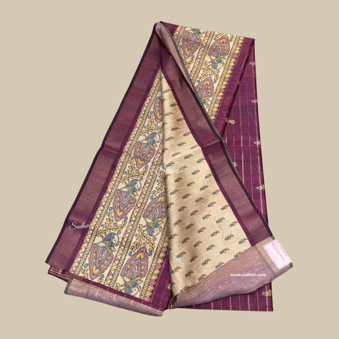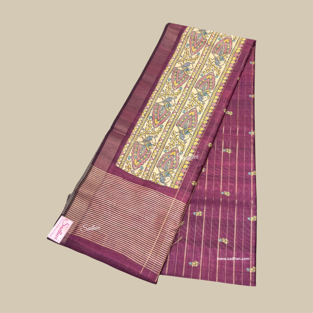 Elevate your ethnic wardrobe with this exquisite Deep Wine Tussar Silk Saree featuring a beautifully printed Kalamkari border. Crafted from premium Tussar silk, this saree combines rich texture with a graceful drape. The deep wine hue exudes sophistication, while the intricate Kalamkari motifs on the border add a traditional, artisanal touch. Perfect for festive occasions, weddings, or cultural celebrations, this saree is a timeless blend of heritage and elegance.