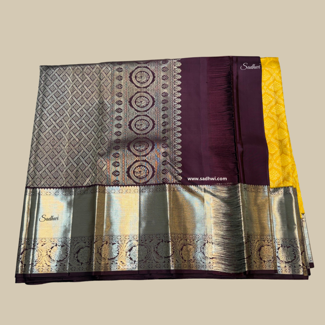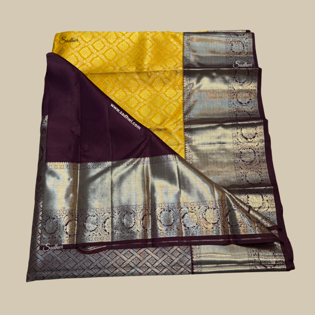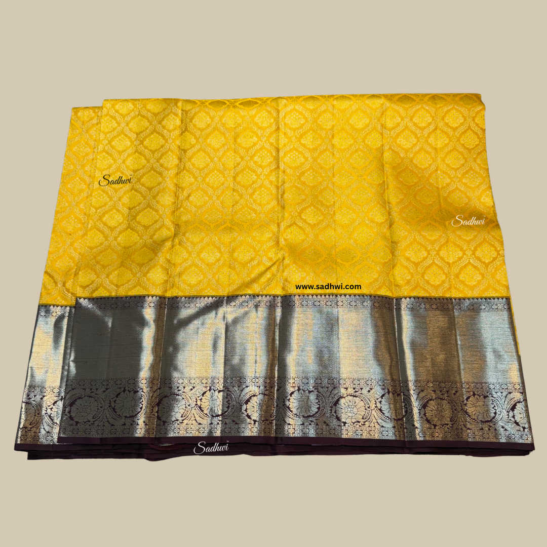 Radiate elegance and heritage with this magnificent Golden Yellow with Brown Traditional Pure Kanchipuram Silk Saree, a true symbol of timeless grandeur and artisanal mastery. The saree’s vibrant golden yellow body glows like liquid sunshine, exuding an aura of prosperity, joy, and festive opulence. Complementing this brilliance is the deep, rich brown border and pallu, intricately woven to perfection and enhanced with the regal charm of pure gold zari work, creating a breathtaking contrast that embodies royal sophistication. Handcrafted from the finest pure mulberry silk, this saree boasts a lustrous sheen, luxurious texture, and graceful drape that flows with effortless beauty. The intricate motifs and traditional temple-inspired patterns adorning the saree stand as a testament to the centuries-old legacy of Kanchipuram weaving, where every thread tells a tale of devotion and artistry. Perfect for weddings, grand festivities, or cultural celebrations, this masterpiece radiates a sense of divine charm and traditional allure. Its bold yet graceful color palette makes it a timeless addition to every woman’s wardrobe, blending heritage with contemporary elegance. Drape it with confidence and pair it with classic temple jewelry to complete your resplendent look. This Golden Yellow with Brown Kanchipuram Silk Saree is not merely a garment—it is an heirloom of tradition, luxury, and eternal beauty woven in silk.