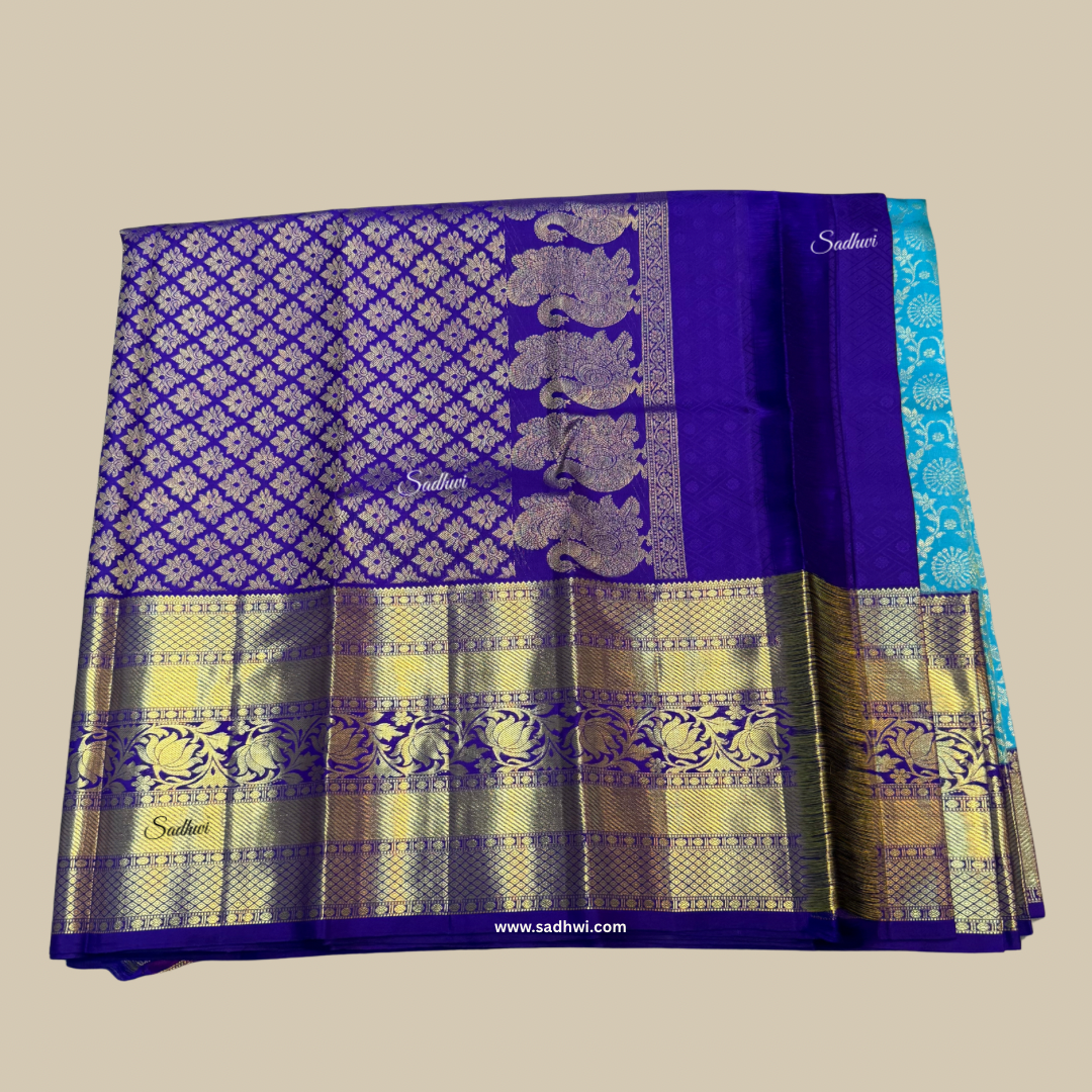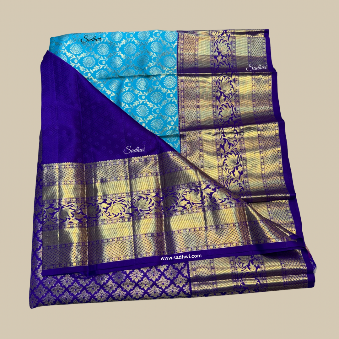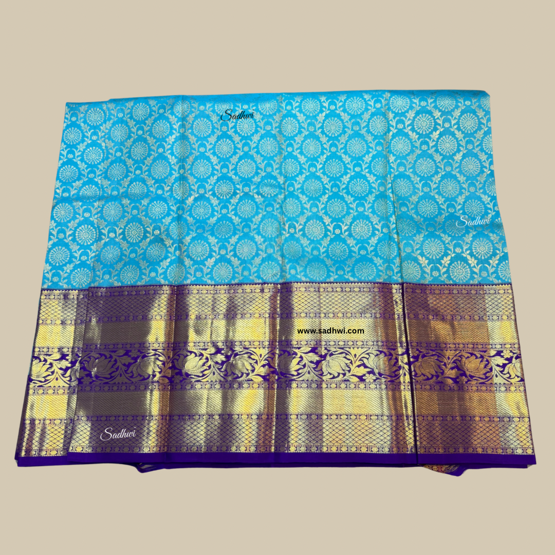 Immerse yourself in the serene charm of tradition with this exquisite Icy Blue with Navy Blue Traditional Pure Kanchipuram Silk Saree, a mesmerizing creation that embodies elegance, purity, and timeless craftsmanship. The cool icy blue body radiates an ethereal glow, symbolizing tranquility and grace, while the rich navy blue border and palluadd a royal depth that enhances the saree’s majestic appeal. Expertly handwoven from pure mulberry silk, this luxurious drape showcases a brilliant sheen, buttery-soft texture, and impeccable craftsmanship unique to Kanchipuram weavers. The saree is adorned with delicate gold zari motifs and intricate traditional patterns, creating a harmonious blend of sophistication and heritage. Each thread weaves together stories of devotion, artistry, and legacy, making it a true testament to the grandeur of South Indian weaving traditions. Perfect for weddings, festive occasions, and grand celebrations, this masterpiece captures the essence of timeless beauty and regal allure. The contrast of subtle serenity and royal depth makes it an enchanting choice for the modern woman with a love for tradition. Pair it with antique gold or silver jewelry to complete your divine ensemble. This Icy Blue with Navy Blue Kanchipuram Silk Saree is not just attire—it’s poetry in silk, a heritage treasure crafted to make every moment unforgettable.