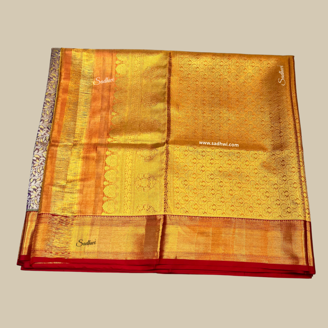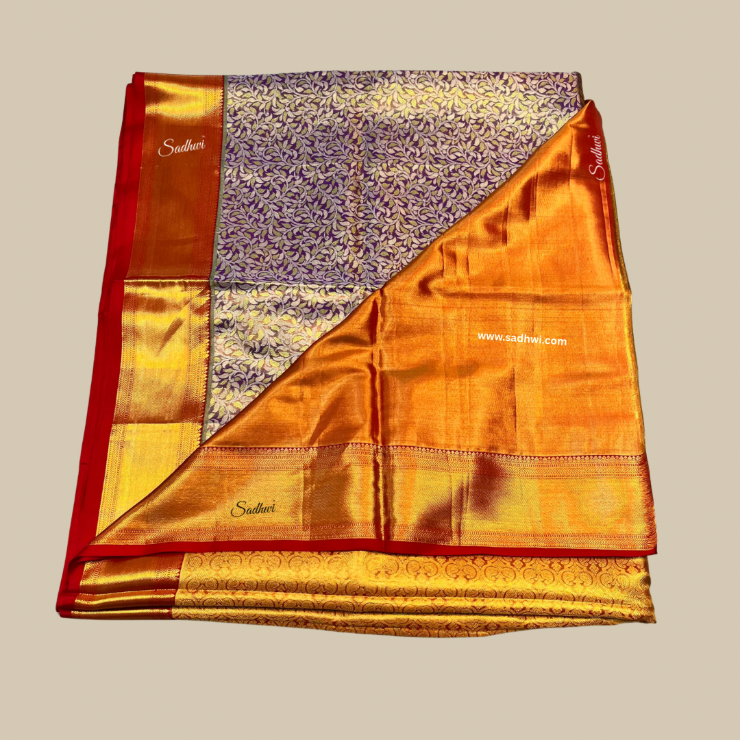 Unveil a world of regal elegance with this Lavender With Deep Red Pure Designer Kanchipuram Silk Saree, a splendid expression of timeless artistry and modern charm. Crafted from authentic pure silk, this handwoven marvel radiates grace with its soothing lavender body, symbolizing serenity and sophistication. The rich deep red border and pallu, intricately embellished with antique gold zari, create a dramatic contrast that exudes royal grandeur. Every weave is a testament to the legacy of Kanchipuram craftsmanship, blending cultural richness with designer finesse. Traditional motifs, inspired by temple architecture and nature, adorn the saree with exquisite precision. The opulent zari work catches the light beautifully, creating an aura of subtle glamour. Ideal for weddings, festive occasions, and heirloom collections, this saree is a treasure meant to be cherished. The contrast blouse piece completes the look with refined elegance. A harmony of color, culture, and couture, this saree is made for the woman who embraces tradition with a touch of modern luxury. It’s not just an outfit—it’s an everlasting statement of grace. Wear heritage, wear royalty.