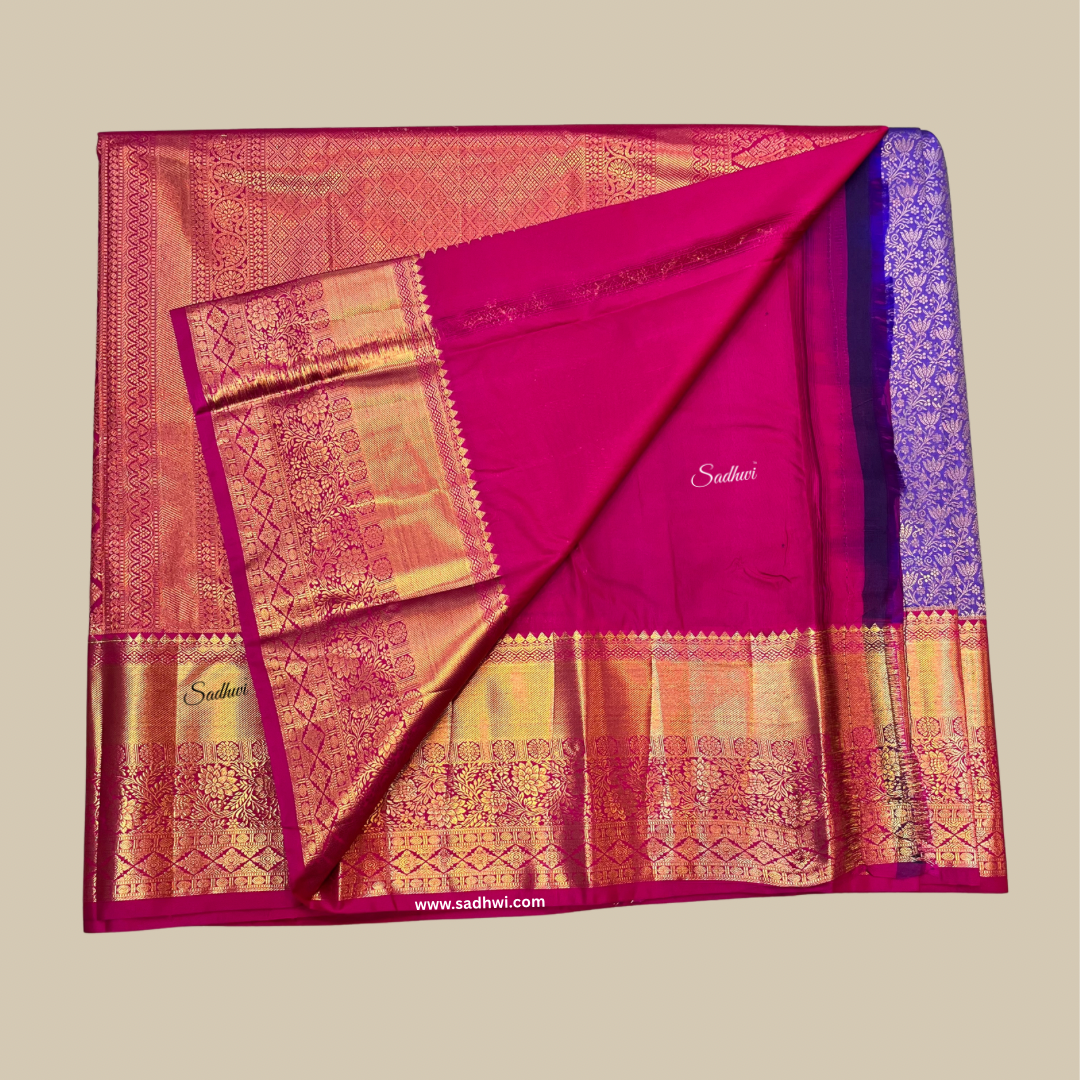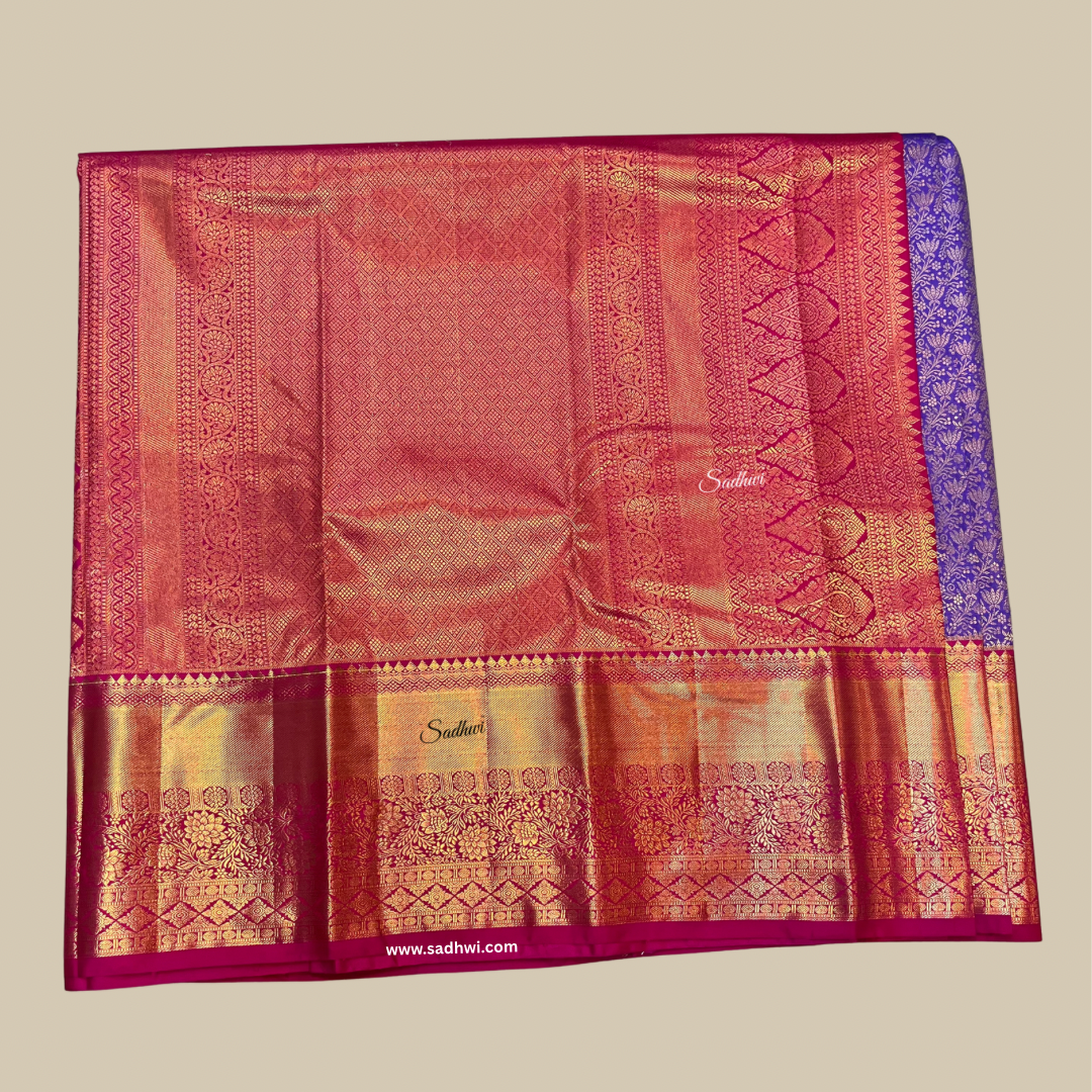 Delicate yet distinctive, this Lavender with Reddish Pink Kanchipuram Silk Saree is a true celebration of grace and tradition. The soft lavender silk body is beautifully complemented by intricate golden zari motifs, offering a serene and sophisticated look. A vibrant reddish pink border and richly woven pallu create a striking contrast, adding depth and grandeur to the ensemble. Handwoven by skilled artisans, this saree is perfect for weddings, festive occasions, and special celebrations. Includes a matching blouse piece to complete your elegant traditional attire.