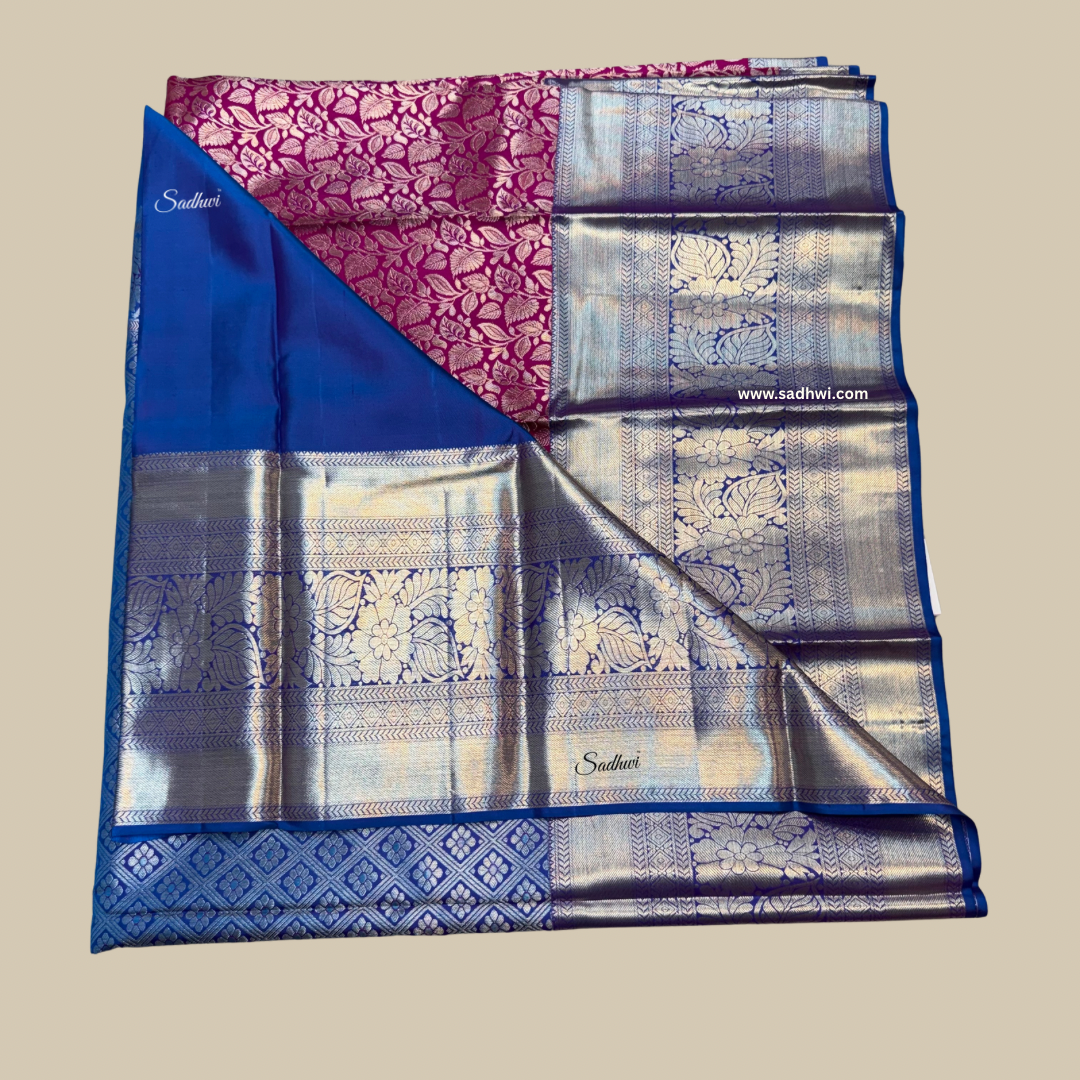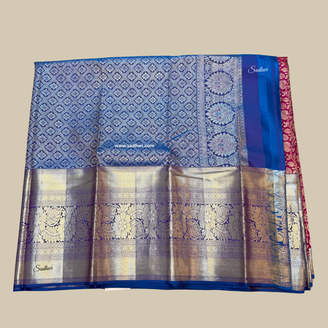 Immerse yourself in the splendor of timeless tradition with this Light Wine with Blue Traditional Pure Kanchipuram Silk Saree, a mesmerizing creation that embodies the perfect harmony of heritage, artistry, and luxury. Handwoven by master craftsmen from the temple town of Kanchipuram, this saree stands as a tribute to India’s glorious weaving legacy. The rich light wine body, with its soft yet regal undertone, radiates an aura of grace and sophistication, while the contrasting royal blue border adds depth and grandeur to the overall aesthetic. The border and pallu come alive with exquisite pure gold zari work, intricately woven with motifs inspired by South Indian temples, peacocks, and nature’s divine elements, reflecting the weavers’ unparalleled skill and devotion. Crafted from the finest mulberry silk, the fabric glides luxuriously, offering a smooth drape that enhances every silhouette with majestic poise. The glittering zari threads shimmer elegantly under light, evoking an ethereal glow that makes this saree perfect for festive occasions, weddings, and cherished celebrations. Each weave tells a story — of age-old tradition passed down through generations, of artistry that transforms silk into poetry, and of a culture that celebrates womanhood in its purest form. Pair this timeless drape with traditional temple jewelry and a classic bun adorned with jasmine for a look that speaks of regal beauty and cultural pride. More than a garment, this Kanchipuram silk saree is a heirloom of elegance, destined to be treasured for years as a symbol of grace, craftsmanship, and eternal allure.
