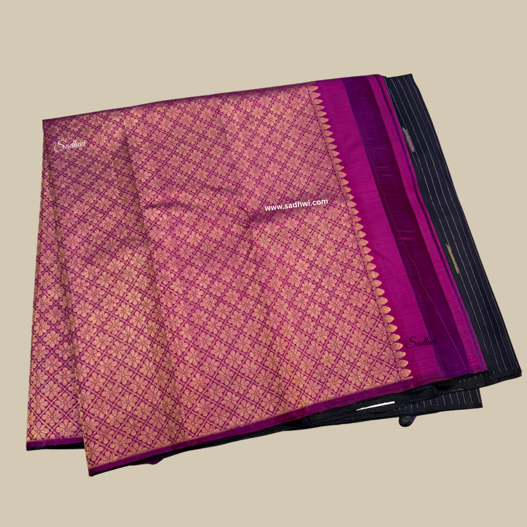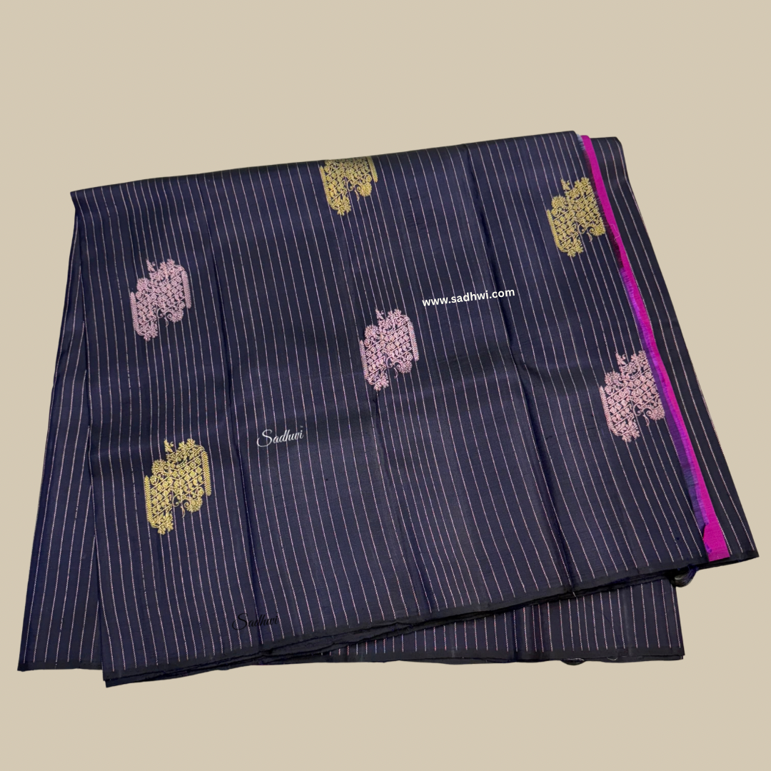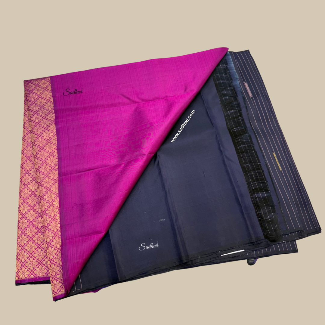 Drenched in a deep, regal navy blue, this Borderless Lines Pure Kanchipuram Silk Saree is a stunning ode to classic elegance with a contemporary soul. Crafted from pure mulberry silk, it features sleek, understated lines woven into the fabric, creating a subtle rhythm that enhances its refined texture. The borderless silhouette allows for a seamless, graceful drape — elevating its minimalist beauty with modern sophistication. Flecks of fine zari shimmer gently across the body, like starlight against a midnight sky. Ideal for evening occasions, formal gatherings, or timeless festive wear, this saree speaks of poise, power, and understated grandeur. A true masterpiece for the woman who carries heritage with quiet confidence.