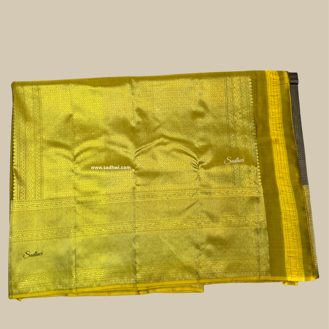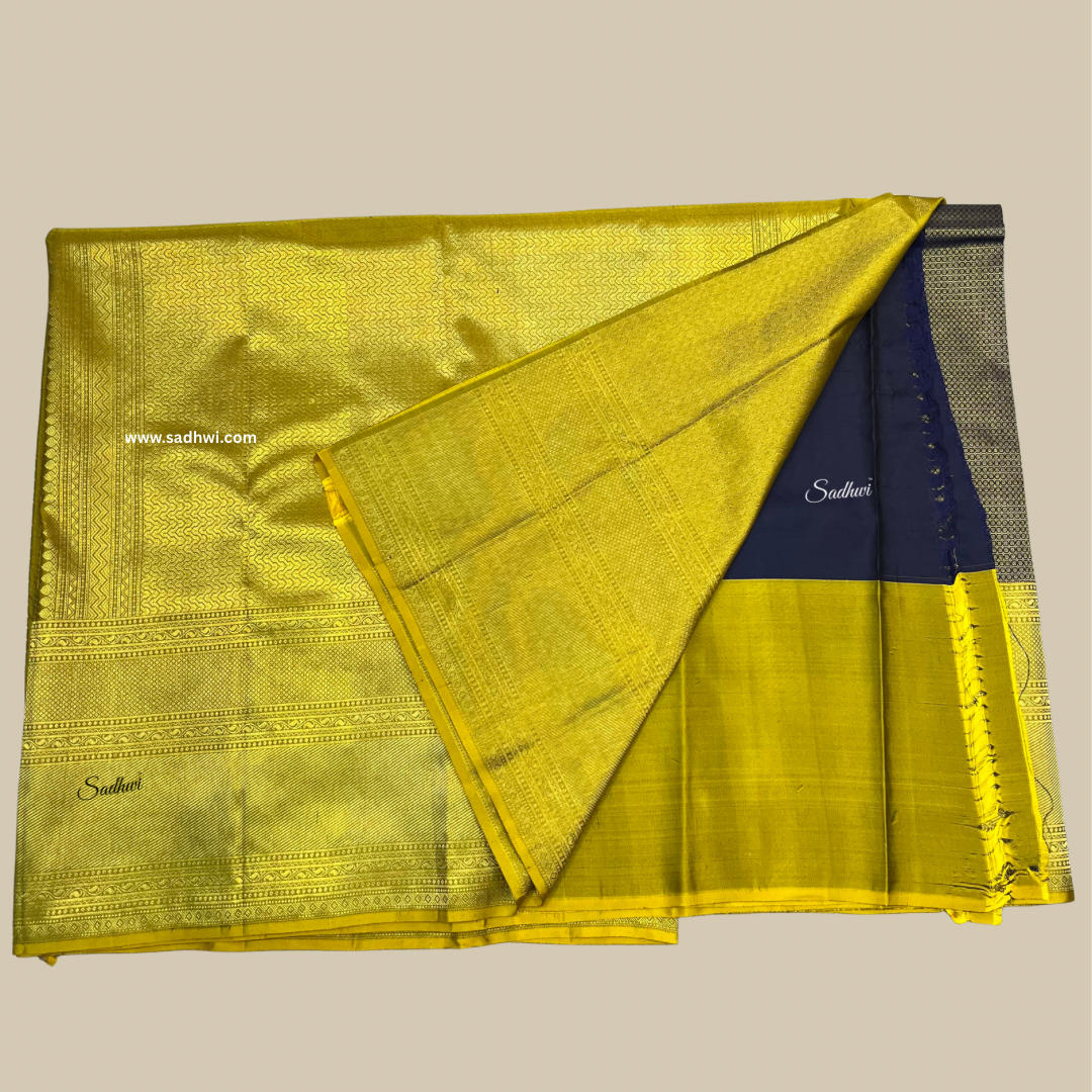 Exude timeless elegance with this majestic Navy Blue with Golden Yellow Pure Kanchipuram Silk Saree, a masterpiece that beautifully balances tradition and grandeur. The deep navy blue body, crafted from pure mulberry silk, is adorned with exquisite gold zari motifs, adding a subtle yet regal shimmer to the drape. A radiant golden yellow border and pallu create a striking contrast, infusing the saree with warmth and celebratory vibrance. The broad zari border is intricately woven with traditional patterns such as temple designs or floral vines, showcasing the finesse of skilled craftsmanship. The golden yellow pallu unfolds in a cascade of rich zari work, offering a perfect finish to this luxurious ensemble. With its naturally lustrous texture and structured drape, this saree is ideal for weddings, festive occasions, and cultural celebrations. It comes with a matching golden yellow blouse piece to complete the look. A true classic, this saree is a radiant reflection of South Indian heritage and elegance.