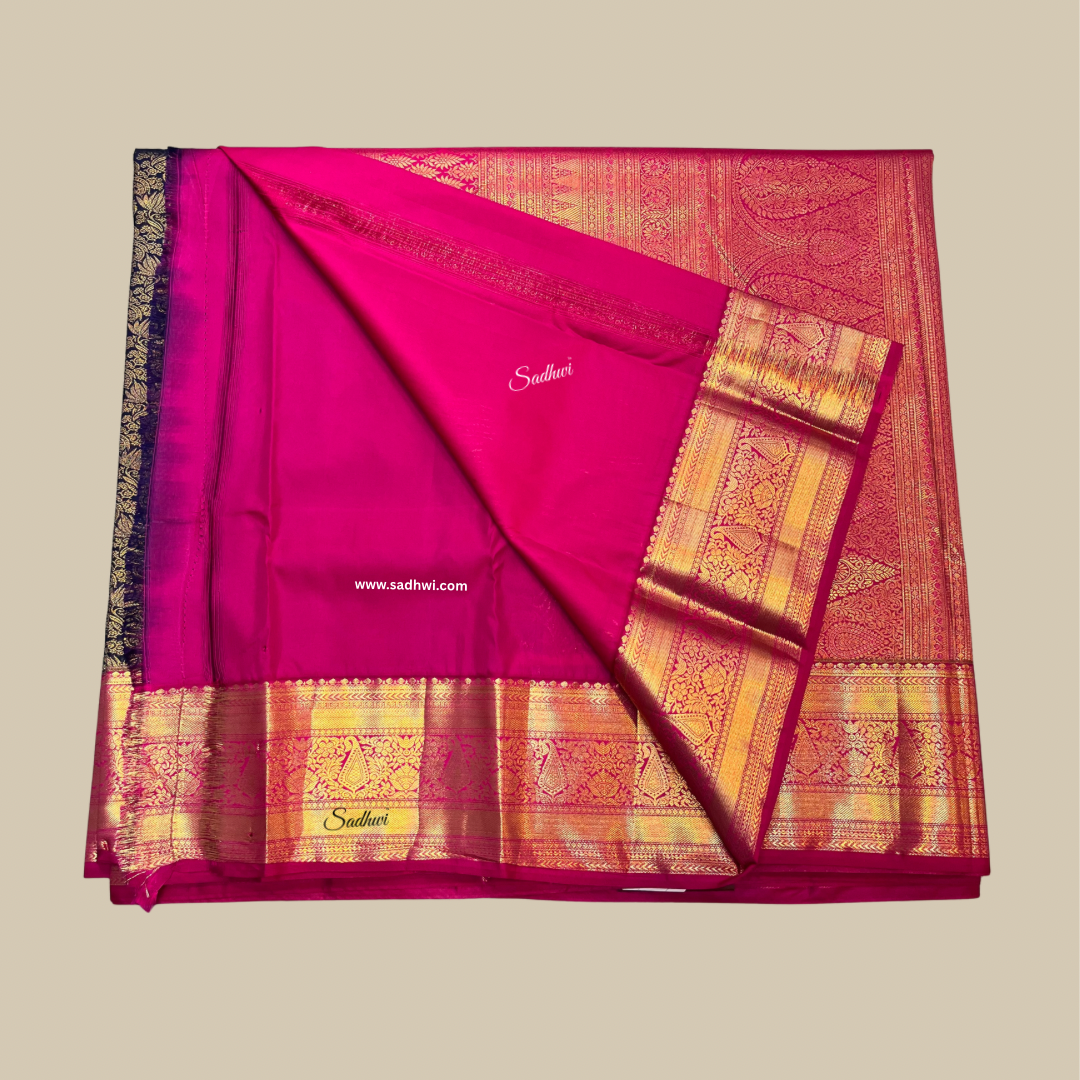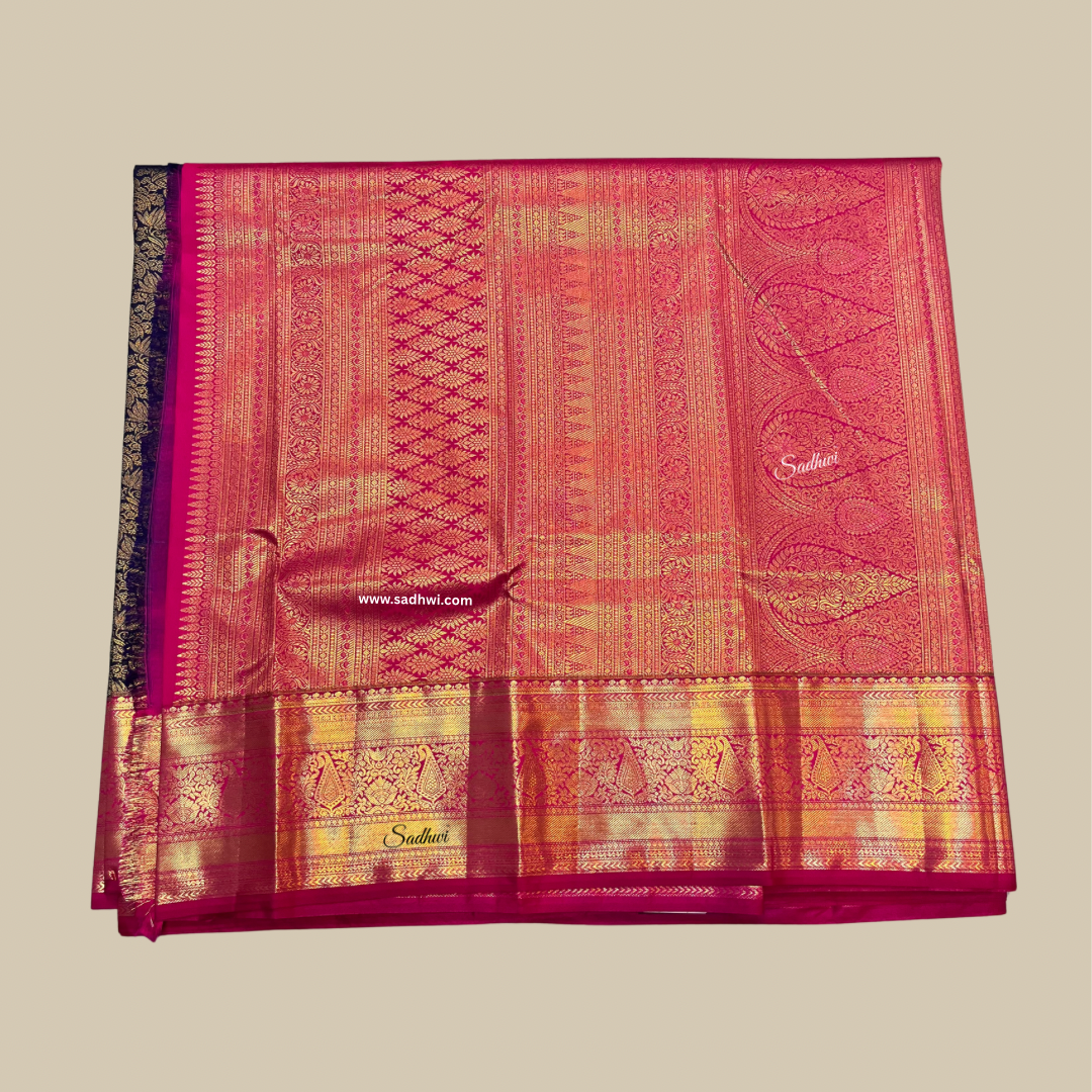 Make a bold and graceful statement with this exquisite Navy Blue with Reddish Pink Kanchipuram Silk Saree. Crafted from premium pure silk, the deep navy blue body is adorned with intricate golden zari motifs that exude regal charm. The vibrant reddish pink border and pallu add a rich contrast, highlighting the traditional craftsmanship of Kanchipuram weaving. Perfect for weddings, festive occasions, and grand celebrations, this saree combines timeless beauty with cultural elegance. A matching blouse piece is included, making it a complete ensemble for a sophisticated and graceful look.
