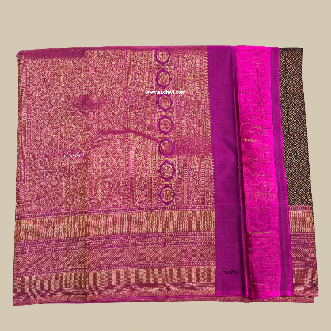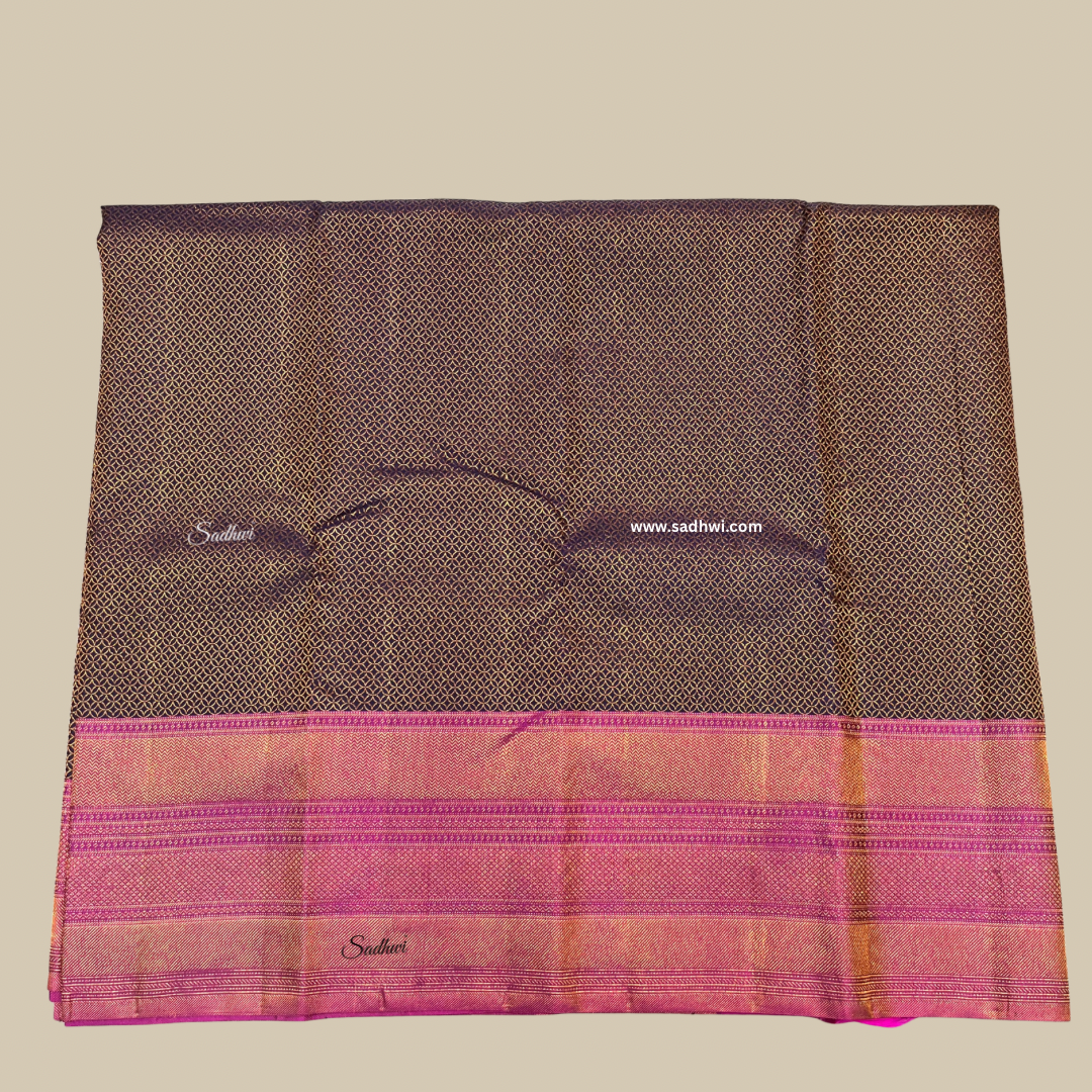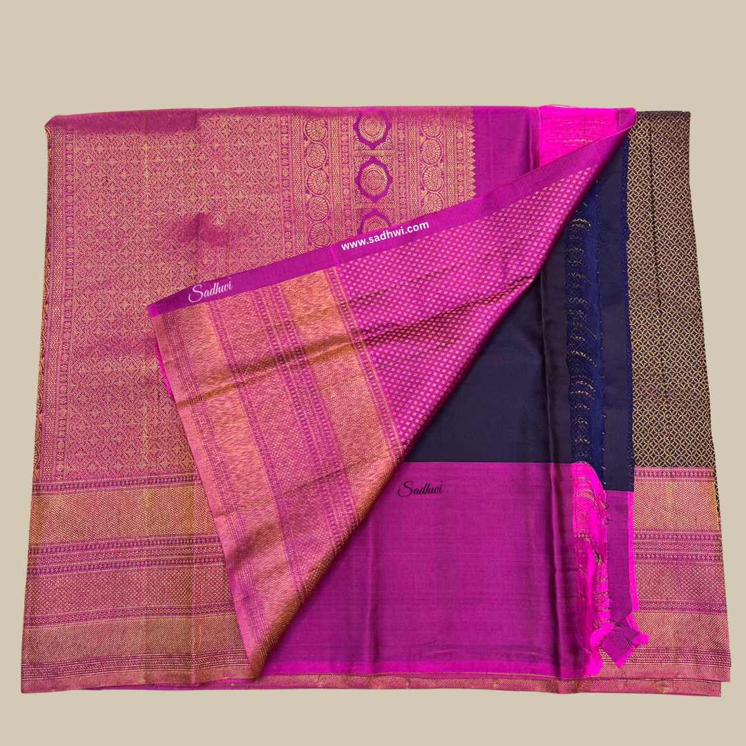 Embody grace and grandeur in this exquisite Navy Blue with Wine Butta Pure Kanchipuram Silk Saree, a timeless masterpiece steeped in tradition. The deep navy blue body is beautifully adorned with gold zari buttas, intricately handwoven to add a subtle sparkle and rich texture. A striking wine-hued border and pallu offer a regal contrast, elevating the saree’s visual appeal with depth and warmth. Crafted from the finest pure mulberry silk, it features a luxurious drape and a natural sheen that exudes sophistication. The traditional zari work on the pallu reflects the artistry of South India’s celebrated weaving heritage. Its borderless or minimal-border design enhances the butta detailing, allowing the motifs to shine. Paired with a coordinating wine blouse piece, this saree is perfect for weddings, festive occasions, and timeless celebrations. It’s not just a saree—it’s a symbol of culture, craftsmanship, and enduring beauty.
