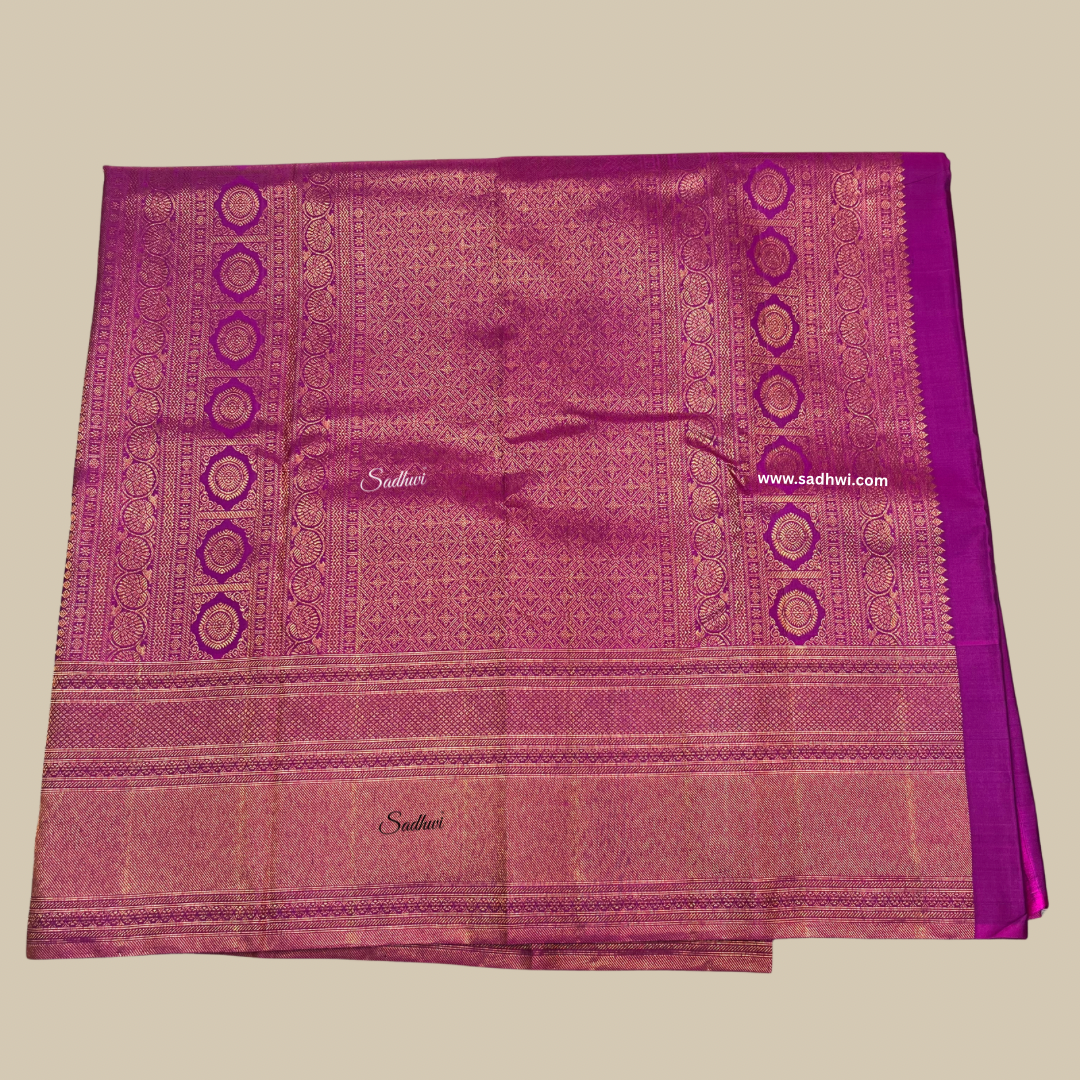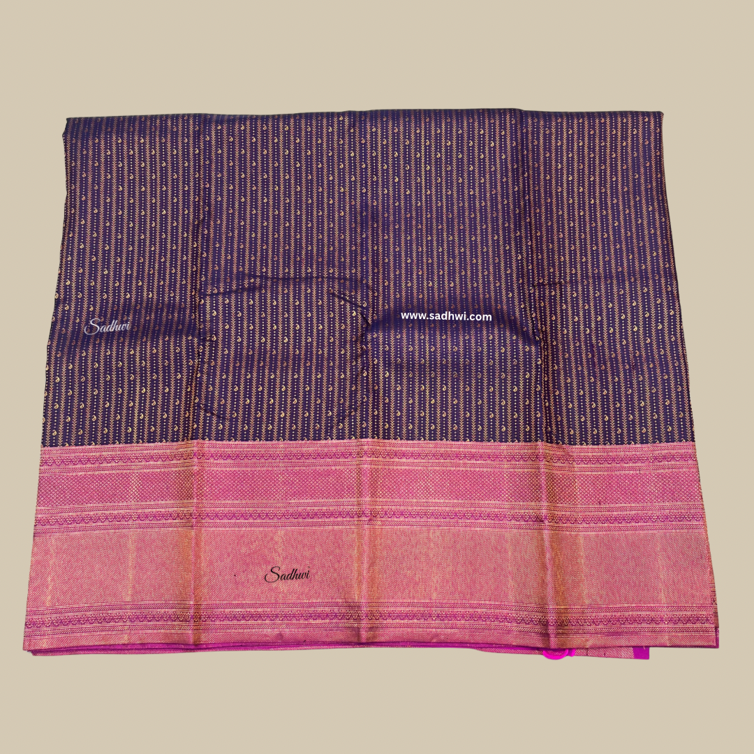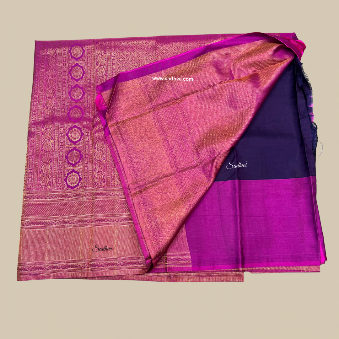 Immerse yourself in the allure of tradition with this Navy Blue and Wine Pure Kanchipuram Silk Saree, a graceful fusion of royal hues and intricate artistry. The deep navy blue body, adorned with shimmering gold zari motifs, radiates timeless sophistication. A rich wine-toned border and pallu lend a bold yet elegant contrast, creating an aura of regal opulence. Handwoven from pure mulberry silk, the saree drapes effortlessly with a luminous sheen that enhances its grandeur. The broad zari border features intricate traditional patterns that echo the legacy of South Indian temple weaves. The wine pallu unveils a cascade of ornate zari work, adding a majestic finish to this heirloom piece. Accompanied by a matching blouse piece, it completes an ensemble meant for celebrations steeped in tradition. This saree is not merely attire—it’s a statement of culture, elegance, and heritage.