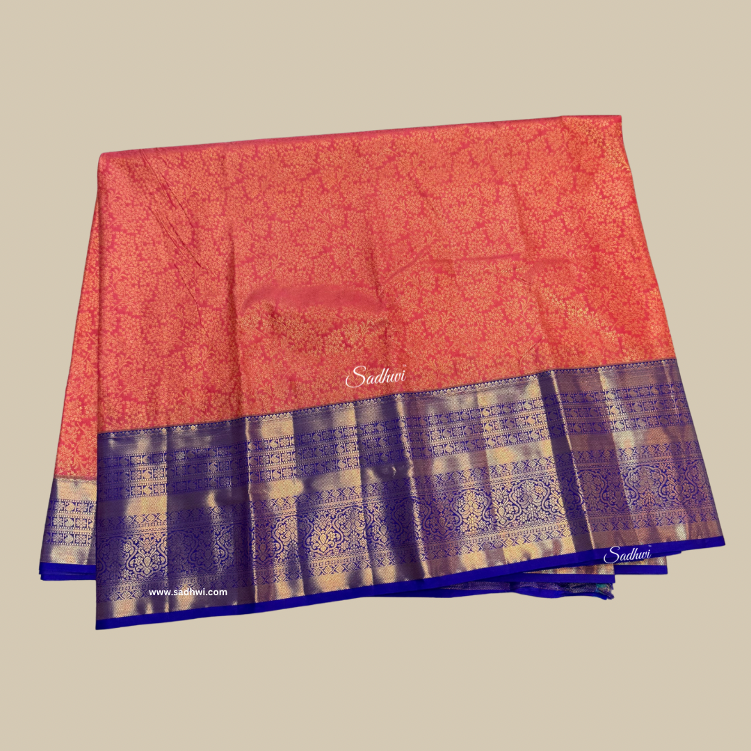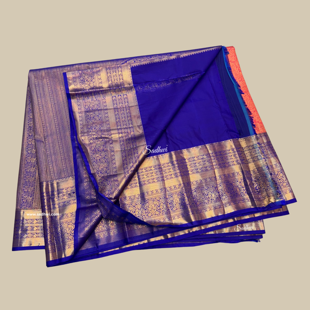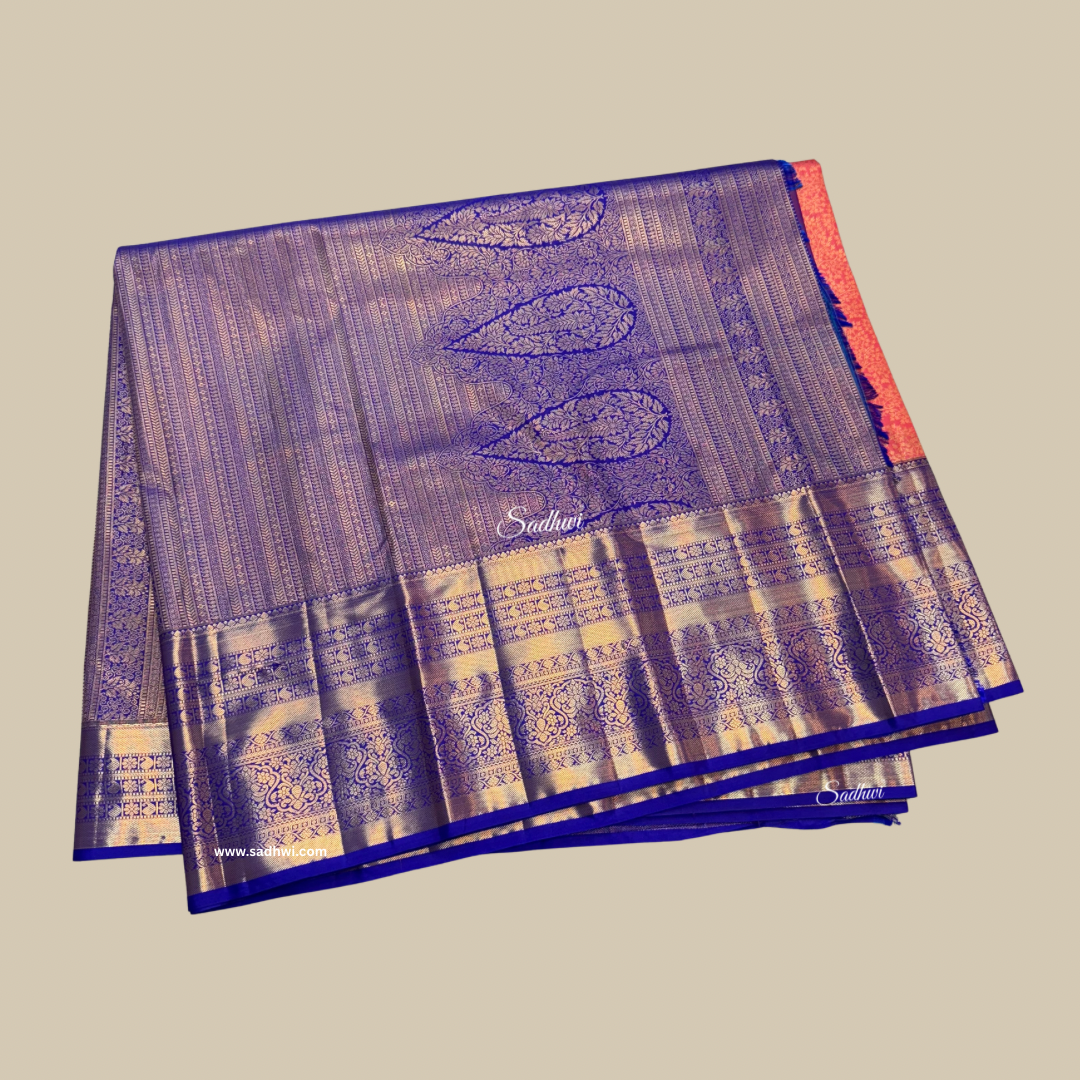 This vibrant Kanchipuram silk saree is a perfect fusion of playful charm and royal elegance. The body is adorned in a stunning orangish pink hue—radiating warmth, femininity, and festive cheer. Woven with delicate gold zari motifs such as traditional floral patterns or geometric buttas, the saree captures the essence of timeless beauty. The deep navy blue border and pallu provide a striking contrast, richly embellished with intricate zari work in classic South Indian designs like peacocks, vines, or temple borders. Ideal for weddings, receptions, or festive occasions, this saree brings together color, culture, and craftsmanship in a truly captivating ensemble.