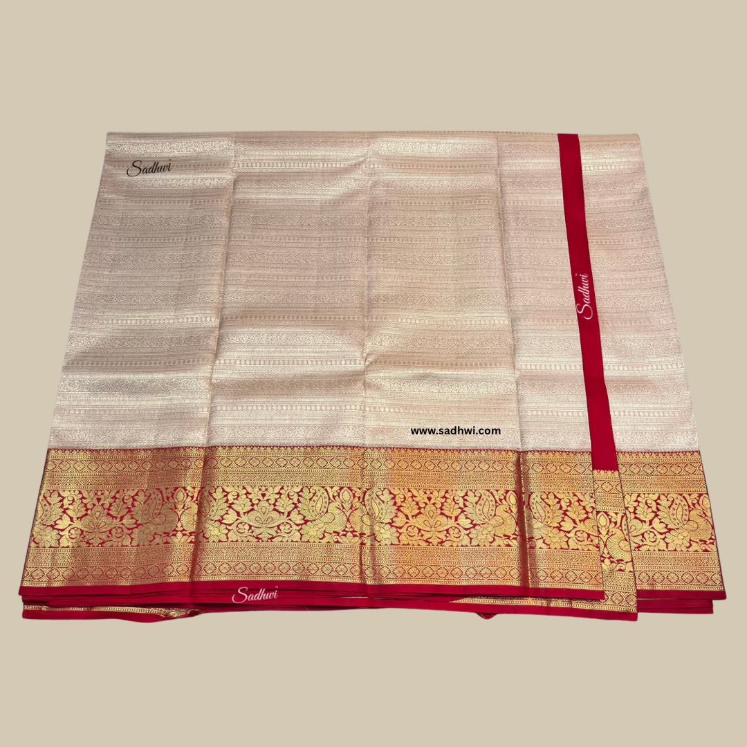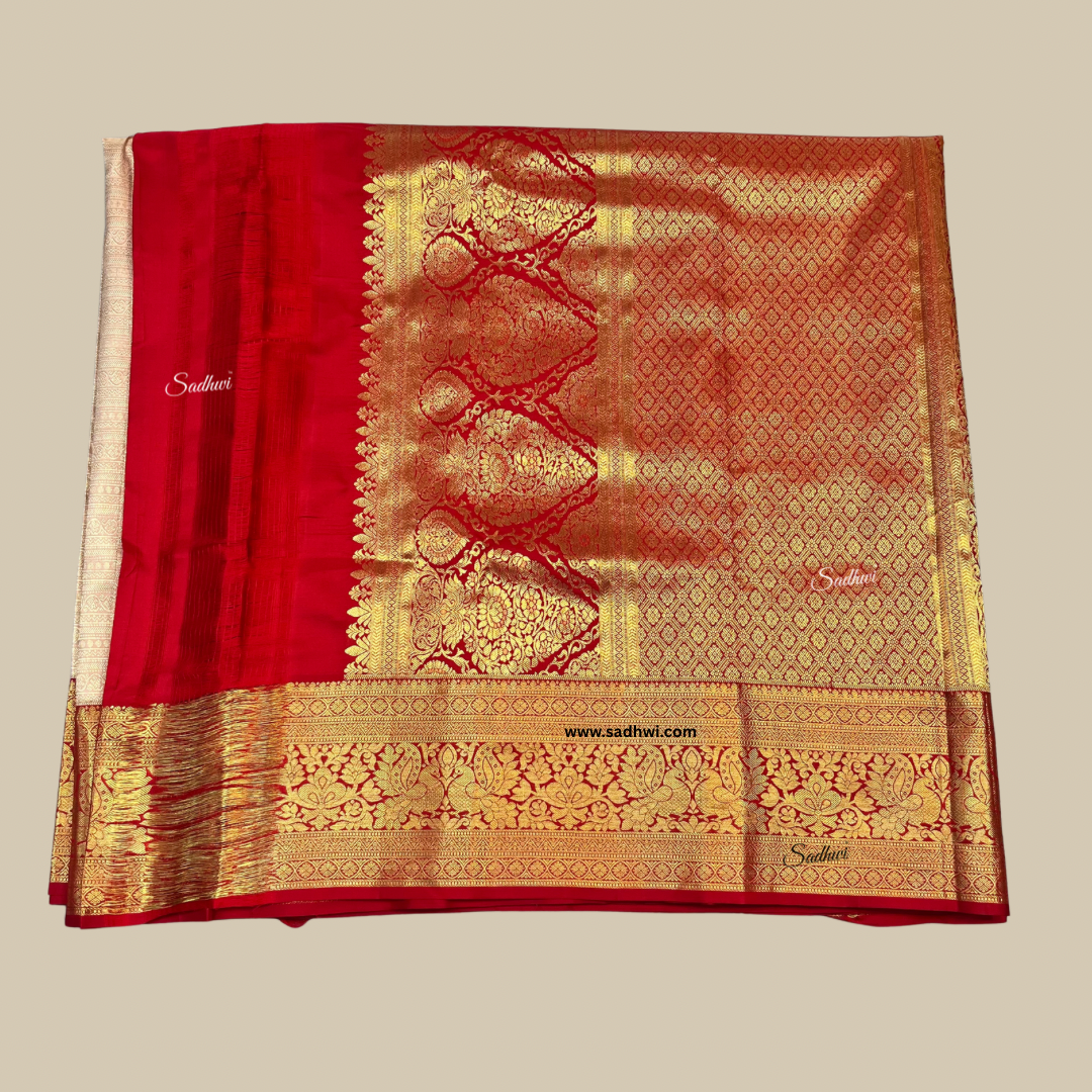 Step into timeless elegance with this exquisite Peach and Red Pure Kanchipuram Silk Saree, a radiant blend of softness and tradition. Woven from authentic pure mulberry silk, the saree features a delicate peach-hued body that exudes feminine grace and subtle charm. The fabric shimmers gently under light, enriched with gold zari buttas that resemble golden blooms scattered across a sunrise sky. The bold crimson red border and pallu, crafted using the intricate korvai technique, provide a striking contrast that elevates the saree’s visual allure. Traditional motifs — from majestic peacocks to sacred temple patterns — adorn the pallu in breathtaking detail. Each weave tells a tale of South India’s revered silk legacy, passed down through generations of master artisans. Perfect for bridal moments, grand celebrations, and festive rituals, this saree is both timeless and resplendent. Let every drape reflect your poise, pride, and cultural heritage. Own not just a saree — but a story woven in silk.