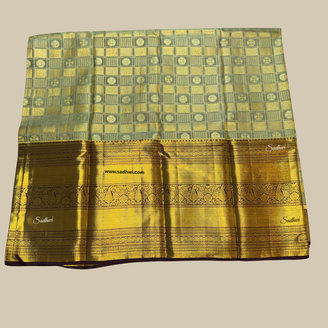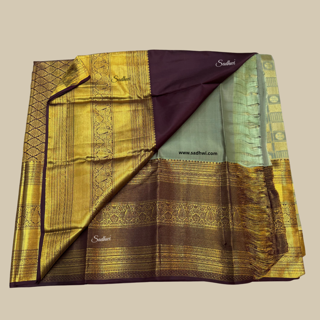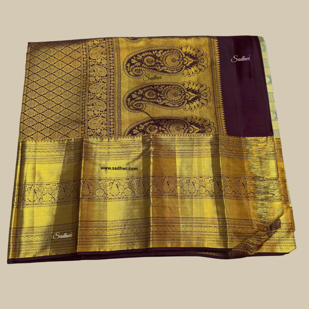 Embrace timeless sophistication with this stunning Pista Green with Brown Pure Traditional Kanchipuram Silk Saree, a perfect blend of subtle charm and regal finesse. The soft pista green body exudes calm elegance, creating a refreshing visual appeal that’s both graceful and unique. Paired with a deep, earthy brown border and pallu, adorned with intricate gold zari weaving, this saree beautifully captures the essence of traditional South Indian craftsmanship. The luxurious Kanchipuram silk drapes effortlessly, offering a rich texture and a radiant sheen that speaks of grandeur. Traditional motifs woven in zari bring heritage to life with every fold and pleat. Ideal for weddings, temple ceremonies, and festive gatherings, this saree is designed for the woman who cherishes culture with refined taste. The contrast blouse piece complements the overall aesthetic, offering endless styling possibilities. A symbol of grace, tradition, and elegance, this saree is not just worn—it’s treasured. Make an everlasting impression draped in this piece of woven art.