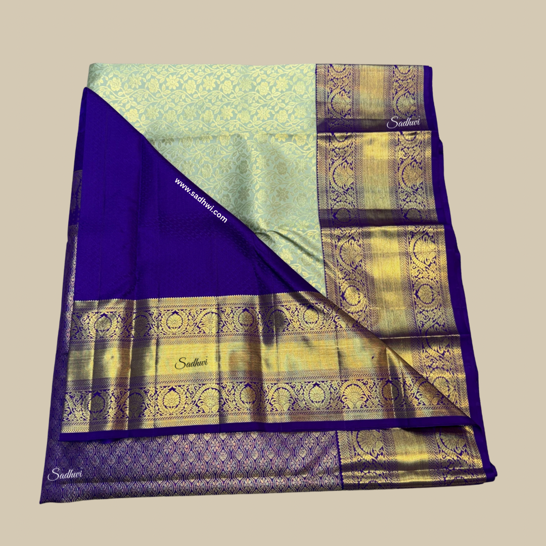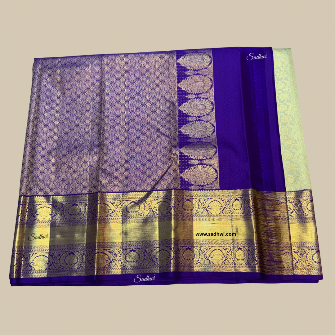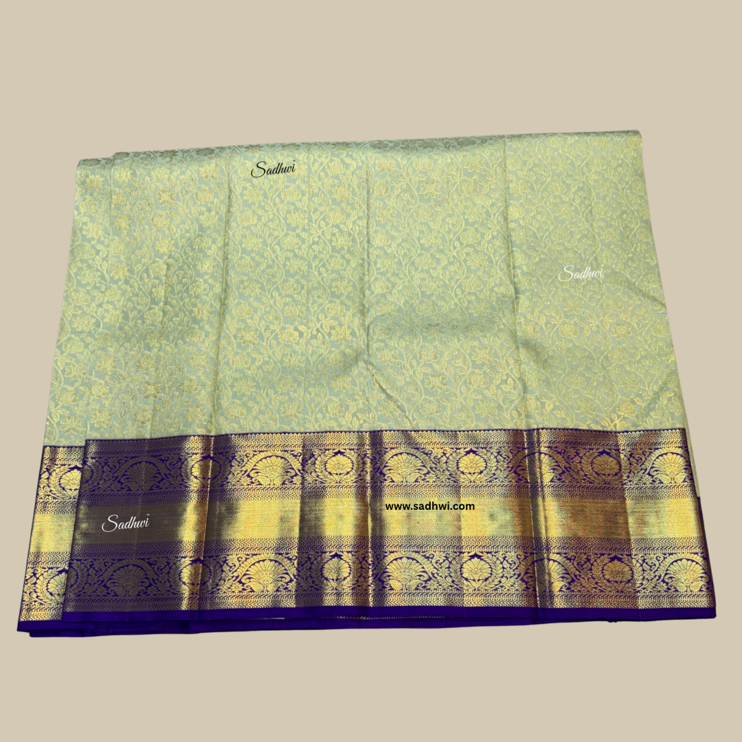 Step into timeless elegance with this stunning Pista Green with Navy Blue Traditional Pure Kanchipuram Silk Saree, a beautiful blend of subtle charm and rich heritage. Handwoven from the finest pure mulberry silk, the saree features a soft pista green body adorned with intricate gold zari motifs that reflect the classic artistry of Kanchipuram weavers. The deep navy blue border and pallu offer a regal contrast, lavishly decorated with traditional patterns and elaborate zari work that add depth and grandeur to the drape. Perfect for weddings, festive occasions, and cultural celebrations, this saree exudes sophistication while honoring age-old traditions. Its smooth, lustrous texture ensures a graceful fall and an opulent finish, making every movement elegant. The ensemble is completed with a contrasting navy blue blouse piece enhanced with fine zari detailing. Lightweight yet luxurious, this saree combines comfort with a majestic presence. For the woman who cherishes tradition with a modern touch, this Kanchipuram silk saree is an heirloom-worthy treasure, destined to leave a lasting impression.