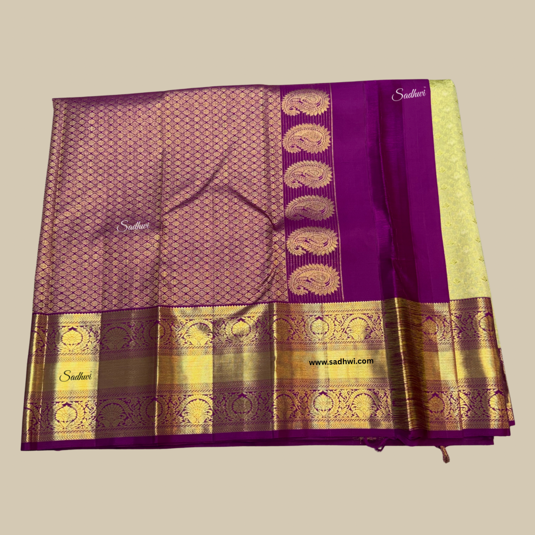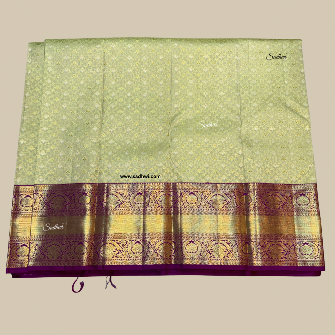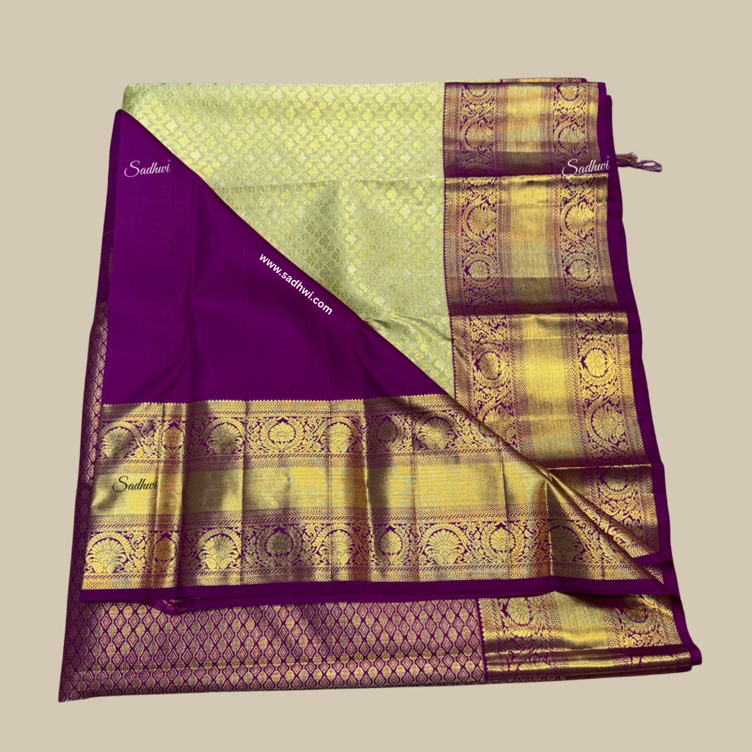 Step into a world of regal splendor with this Pista Green with Purple Traditional Pure Kanchipuram Silk Saree, a breathtaking creation that epitomizes luxury, culture, and grace. Handwoven from the finest mulberry silk, this masterpiece features a serene pista green body that radiates freshness and sophistication, perfectly balanced by a rich royal purple border adorned with exquisite golden zari work. The intricate motifs, inspired by ancient temple art and nature’s elegance, glimmer with every movement, reflecting the timeless artistry of Kanchipuram weavers. The authentic korvai weaving technique seamlessly unites the contrasting hues, creating a mesmerizing harmony that symbolizes tradition blended with modern finesse. Lustrous, smooth, and majestic, this saree drapes like poetry, making it an ideal choice for weddings, festive celebrations, and grand occasions. Every thread tells a story of devotion, heritage, and skill, making this saree not just an attire but a legacy — a radiant expression of timeless beauty, grace, and royal charm.