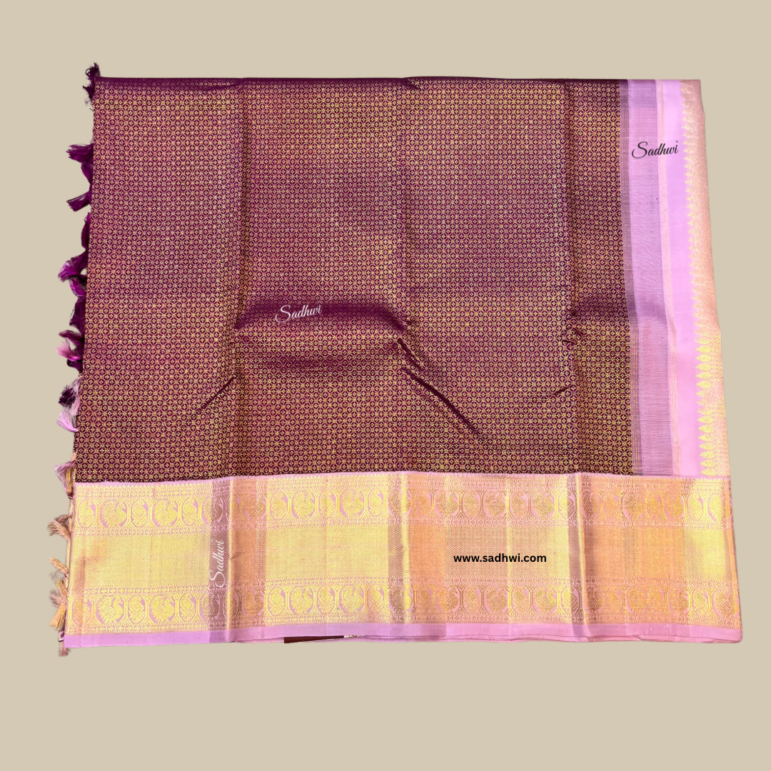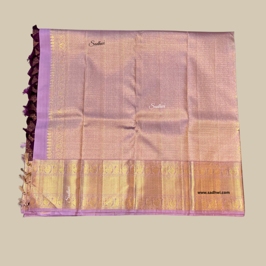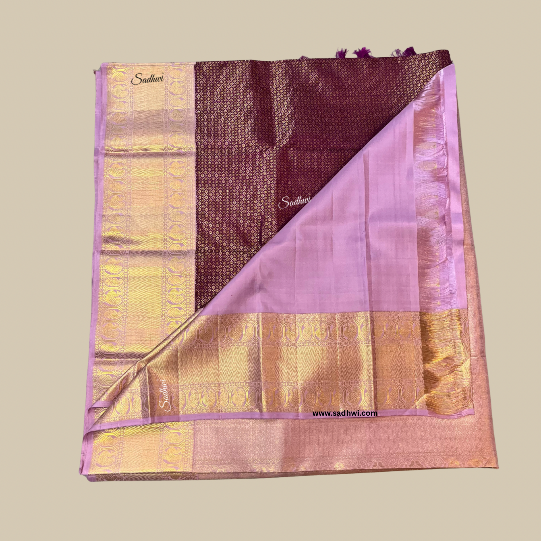 Envelop yourself in regal charm with our Purple with Lavender Pure Traditional Kanchipuram Silk Saree, a divine fusion of royal richness and ethereal beauty. The deep purple body, symbolizing power and elegance, is gracefully complemented by a soft lavender border and pallu—creating a mesmerizing contrast that speaks of sophistication. Woven from pure, lustrous silk by skilled artisans of Kanchipuram, this saree showcases intricate gold zari work that adds timeless opulence to every drape. The interplay of bold and pastel hues offers a unique blend of tradition and modernity. Ideal for weddings, festive occasions, or grand celebrations, it promises a silhouette of grace and grandeur. The luxurious pallu is adorned with traditional motifs, while the lavender detailing lends a touch of delicate femininity. Paired with a coordinated blouse piece, this ensemble is a celebration of cultural artistry. Drape yourself in this masterpiece and let your elegance leave a lasting impression.
