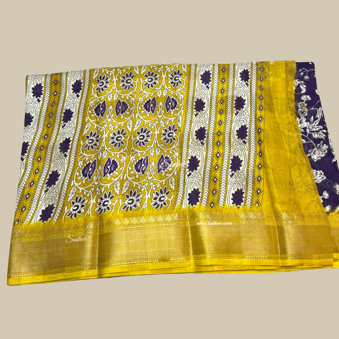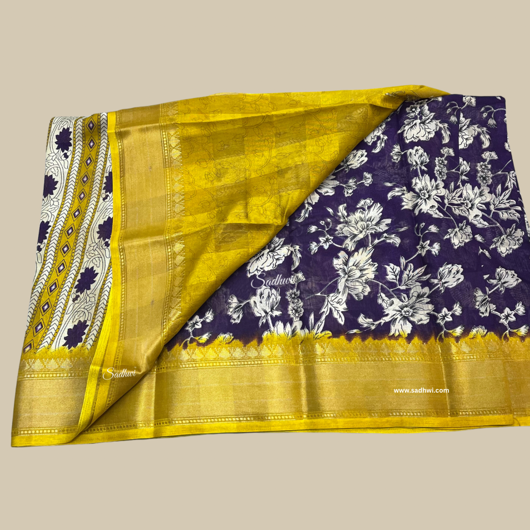 Purple With Yellow Border Printed Cotton Saree