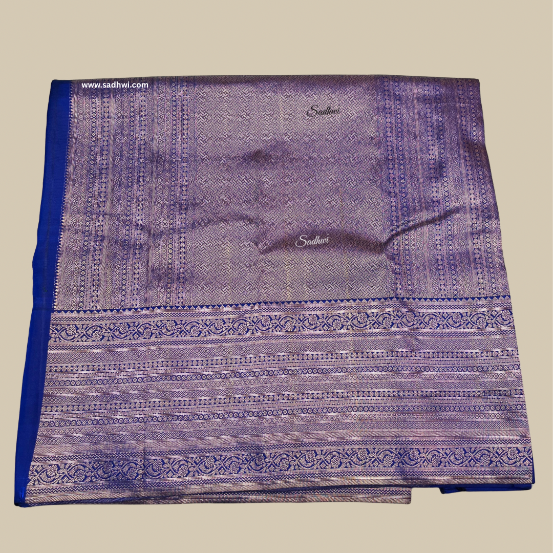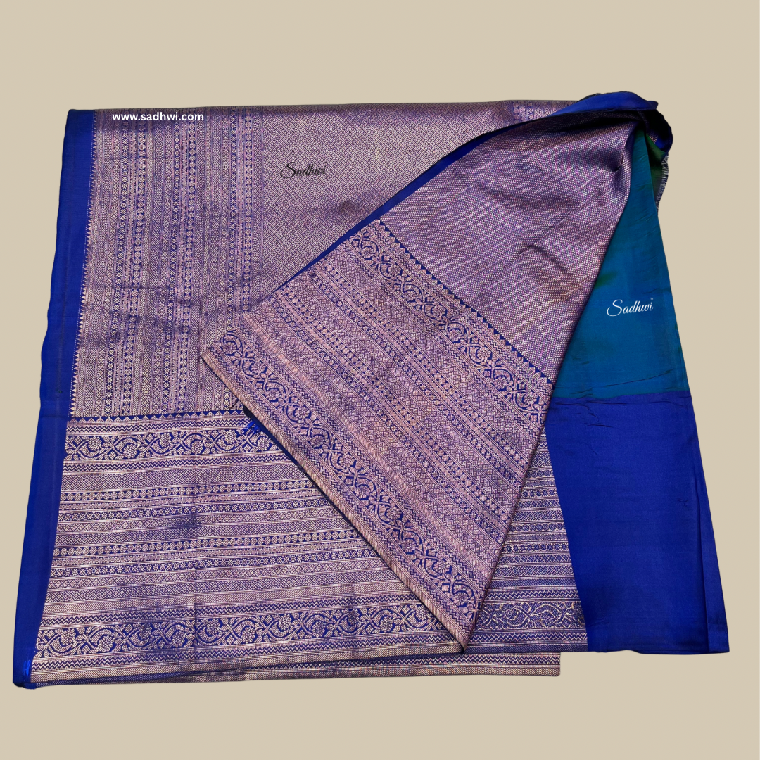 Immerse yourself in timeless elegance with this enchanting Rama Green with Blue Brocade Pure Kanchipuram Silk Saree, a perfect embodiment of tradition and sophistication. The serene rama green body is gracefully woven with subtle zari motifs, exuding charm and refined beauty. A contrasting royal blue brocade border and pallu elevate the saree with rich texture and intricate artistry. The brocade work features classic motifs—like floral vines, paisleys, or geometric patterns—shimmering in fine gold and silver zari, adding depth and opulence. Crafted from pure mulberry silk, the saree drapes beautifully with a lustrous sheen that speaks of luxury and heritage. The grand pallu is a celebration of traditional Kanchipuram weaving, designed to captivate. Paired with a blue brocade blouse piece, this ensemble is ideal for weddings, festive occasions, and special ceremonies. A true statement of elegance, this saree weaves together culture, color, and craftsmanship in every thread.