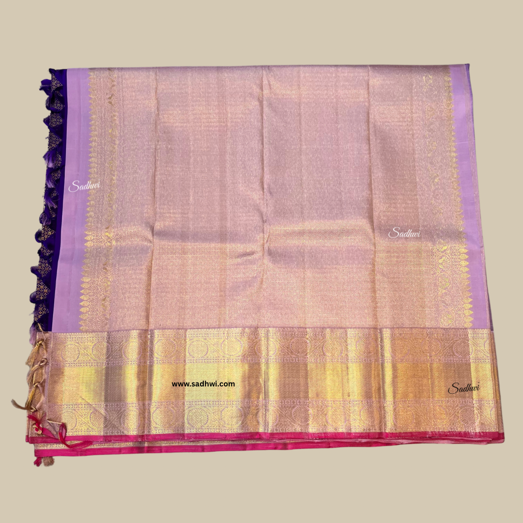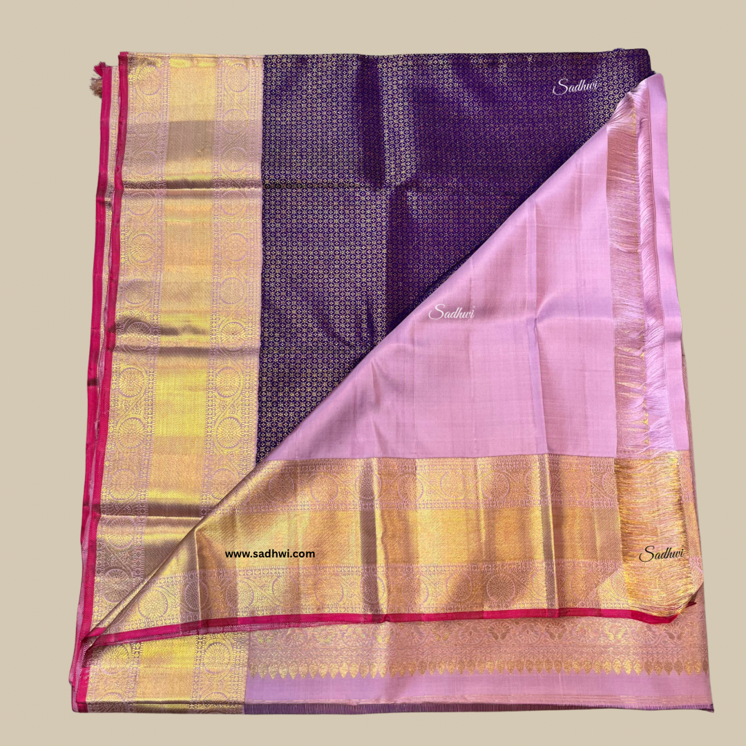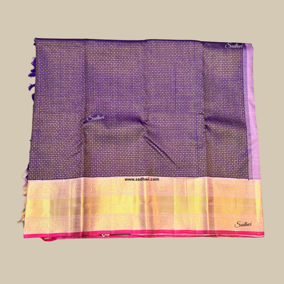 Step into timeless elegance with our Royal Blue with Lavender Pure Traditional Kanchipuram Silk Saree, where bold tradition meets soft sophistication. The majestic royal blue body radiates grandeur, beautifully balanced by a serene lavender border and pallu that add a graceful, contemporary twist. Handwoven from the finest pure silk, this saree is a testament to the rich legacy of Kanchipuram craftsmanship. Adorned with intricate gold zari motifs, it exudes opulence while maintaining an air of refined subtlety. The contrast of vibrant and pastel hues creates a visual harmony that’s both eye-catching and elegant. Ideal for weddings, temple ceremonies, and festive celebrations, it drapes like poetry in motion. The rich lavender pallu is detailed with exquisite traditional patterns, making every fold a work of art. A matching unstitched blouse piece completes the ensemble, offering endless styling possibilities. Celebrate heritage in style—this saree is more than attire, it’s an heirloom in silk.
