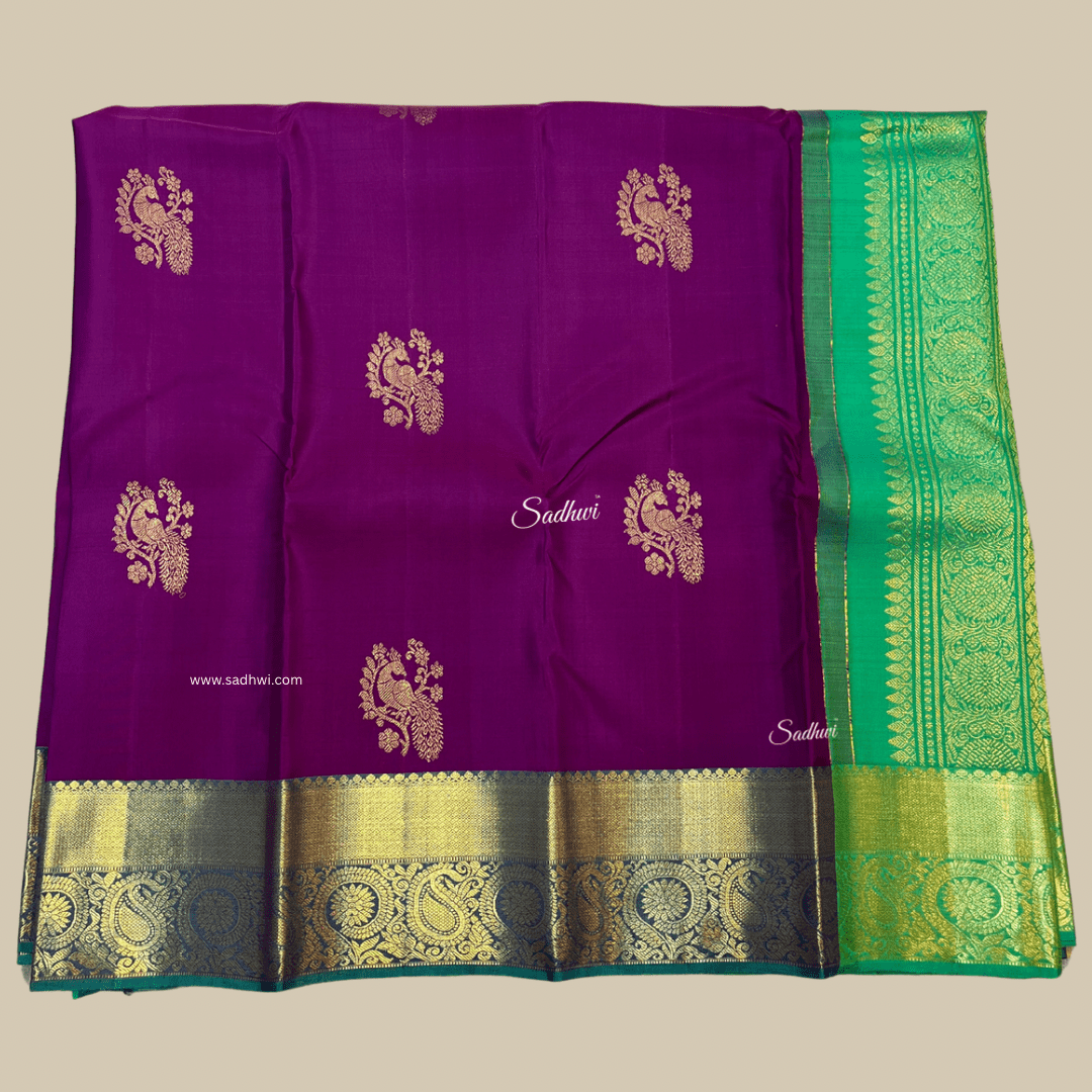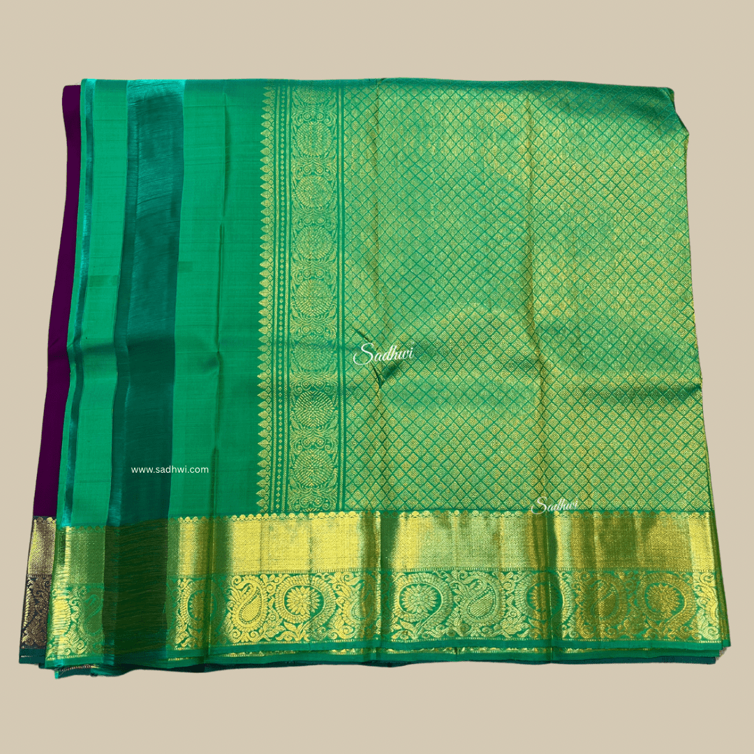 The Royal Purple with Cyan Traditional Pure Kanchipuram Silk Saree is a breathtaking fusion of regal charm and vibrant tradition. Handwoven from pure Kanchipuram silk, it features a rich royal purple body that exudes opulence and dignity, beautifully contrasted by a striking cyan blue border and pallu embellished with intricate gold zari work and traditional South Indian motifs. The luxurious texture and majestic color palette make it a standout choice for weddings, temple ceremonies, and grand festivities. Paired with a coordinated blouse piece, this saree is a timeless classic, celebrating heritage with elegance and bold sophistication.
