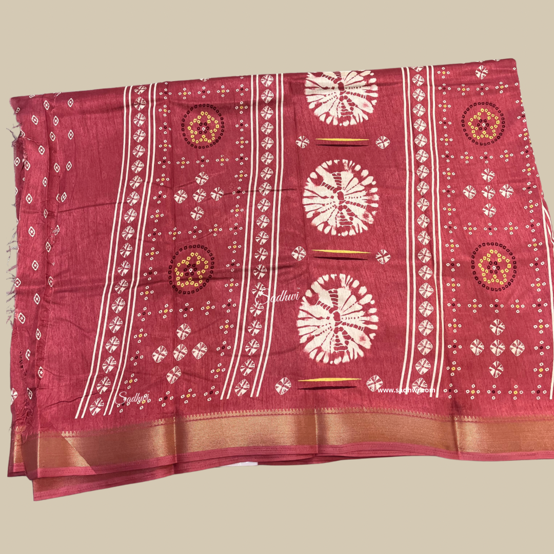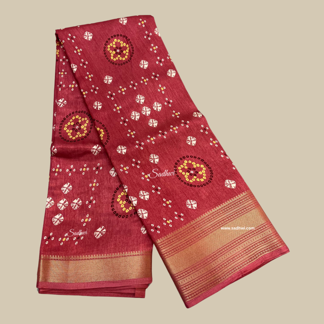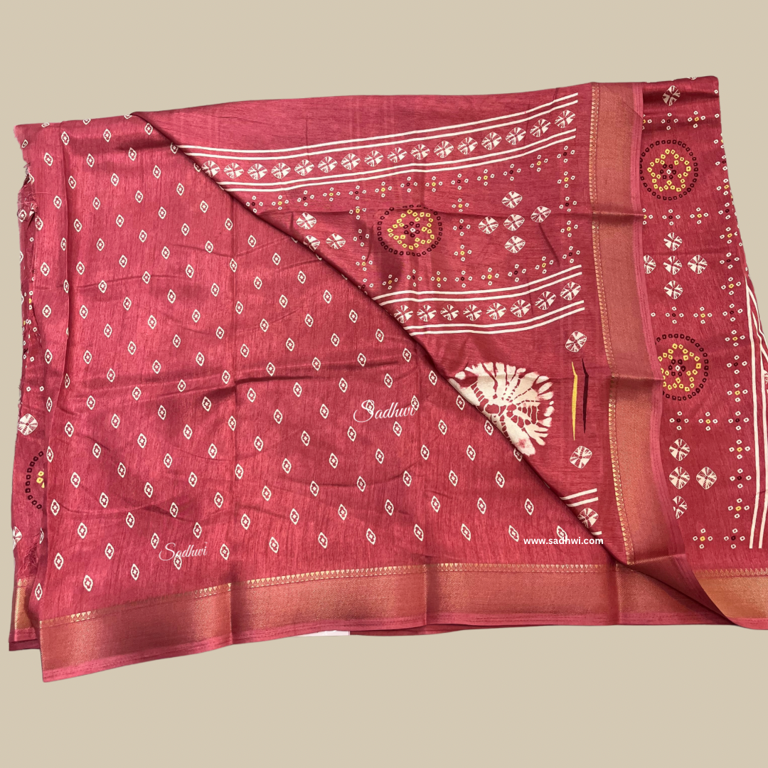 This enchanting shaded pink Dola silk saree features traditional Bandhani-inspired prints that add a vibrant cultural touch to its graceful silhouette. The subtle gradient of pink tones creates a soft, feminine appeal, while the smooth, lustrous texture of Dola silk offers a luxurious drape. Lightweight yet elegant, this saree is perfect for festive occasions, family functions, or cultural events. Blending heritage artistry with contemporary charm, it’s a beautiful expression of timeless style and refined elegance.