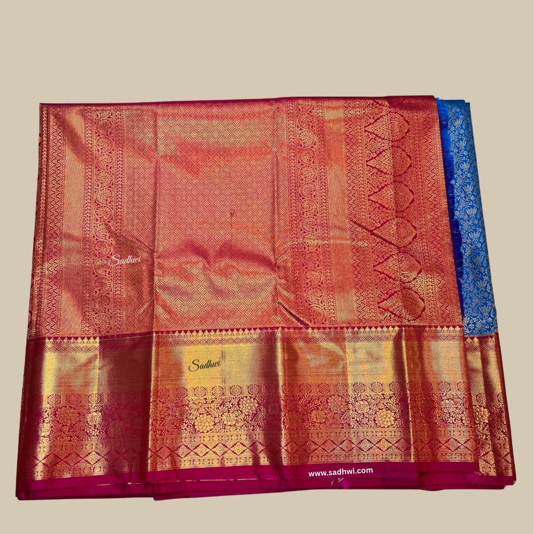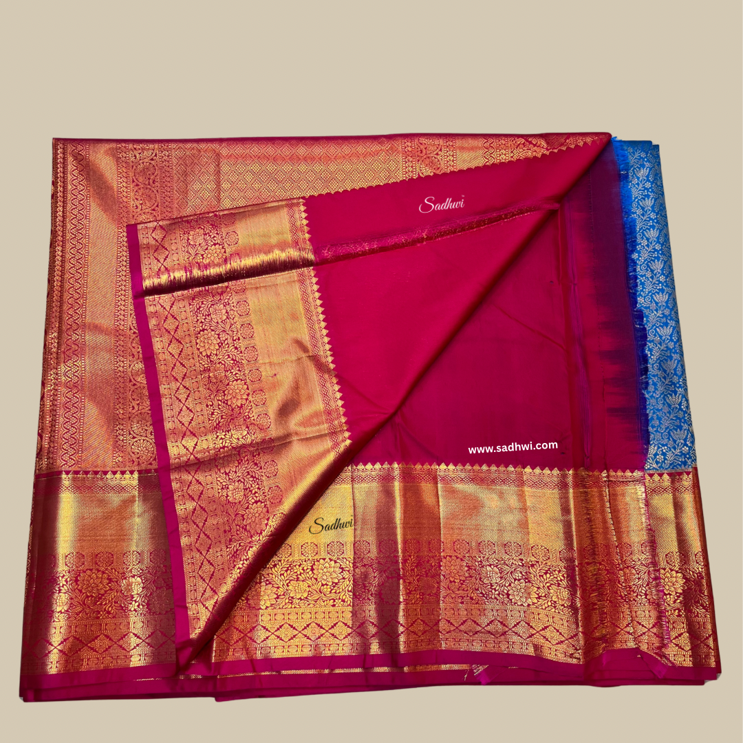 Graceful and striking, this Steel Blue with Reddish Pink Kanchipuram Silk Saree is a perfect fusion of subtle sophistication and vibrant tradition. The steel blue body, intricately woven with shimmering golden zari motifs, offers a cool-toned elegance that stands out effortlessly. A rich reddish pink border and pallu provide a bold contrast, showcasing the craftsmanship and heritage of authentic Kanchipuram weaving. Ideal for festive occasions, weddings, and traditional events, this saree comes with a matching blouse piece to complete your regal attire.