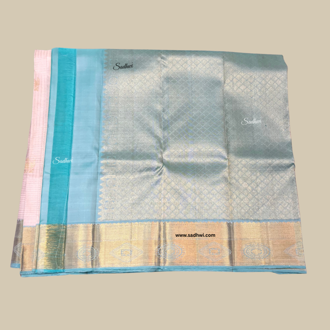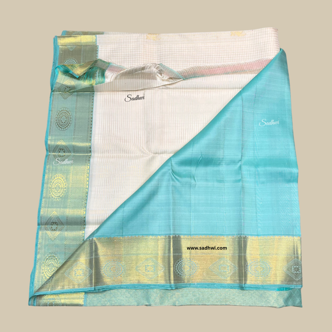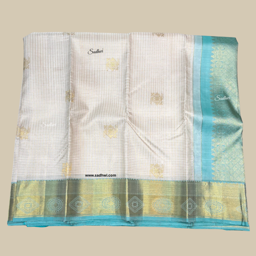 Step into timeless grace with our White with Sky Blue Checks Pure Traditional Kanchipuram Silk Saree, a pristine masterpiece woven in purity and tradition. The classic white base is adorned with delicate sky blue checks, exuding subtle sophistication and understated luxury. Crafted from the finest pure silk, this saree is a harmonious blend of minimalist elegance and intricate craftsmanship. Each check reflects the precision of traditional Kanchipuram weaving, a legacy passed down through generations. The soft, luminous silk drapes with regal fluidity, making it a refined choice for weddings, temple functions, and cultural celebrations. The serene color palette symbolizes purity and tranquility, while the golden zari accents add a whisper of opulence. Finished with a graceful sky blue pallu and a coordinated blouse piece, this saree offers a look that is both rooted in heritage and refreshingly modern. It’s more than a saree—it’s a work of art woven in silk. Let every drape speak of poise, tradition, and timeless beauty.
