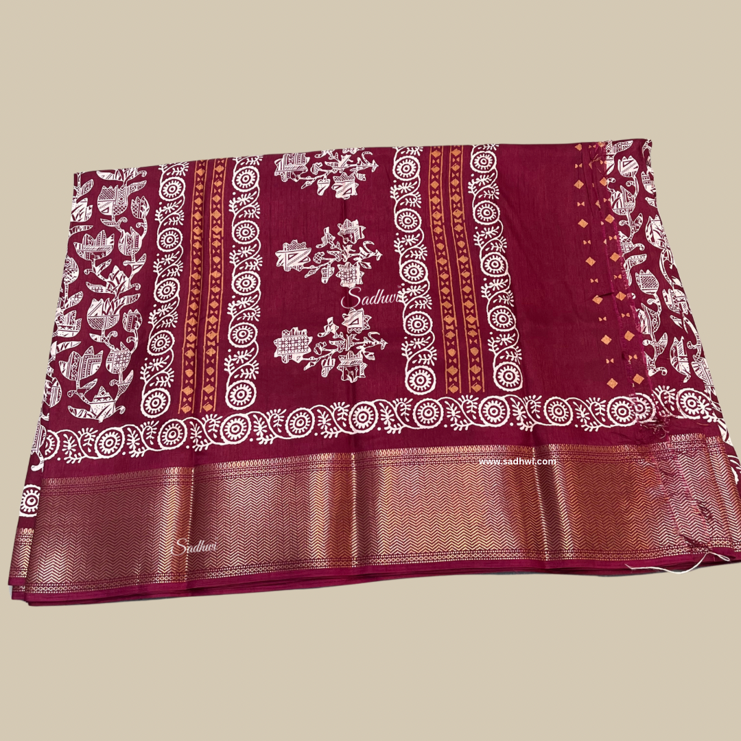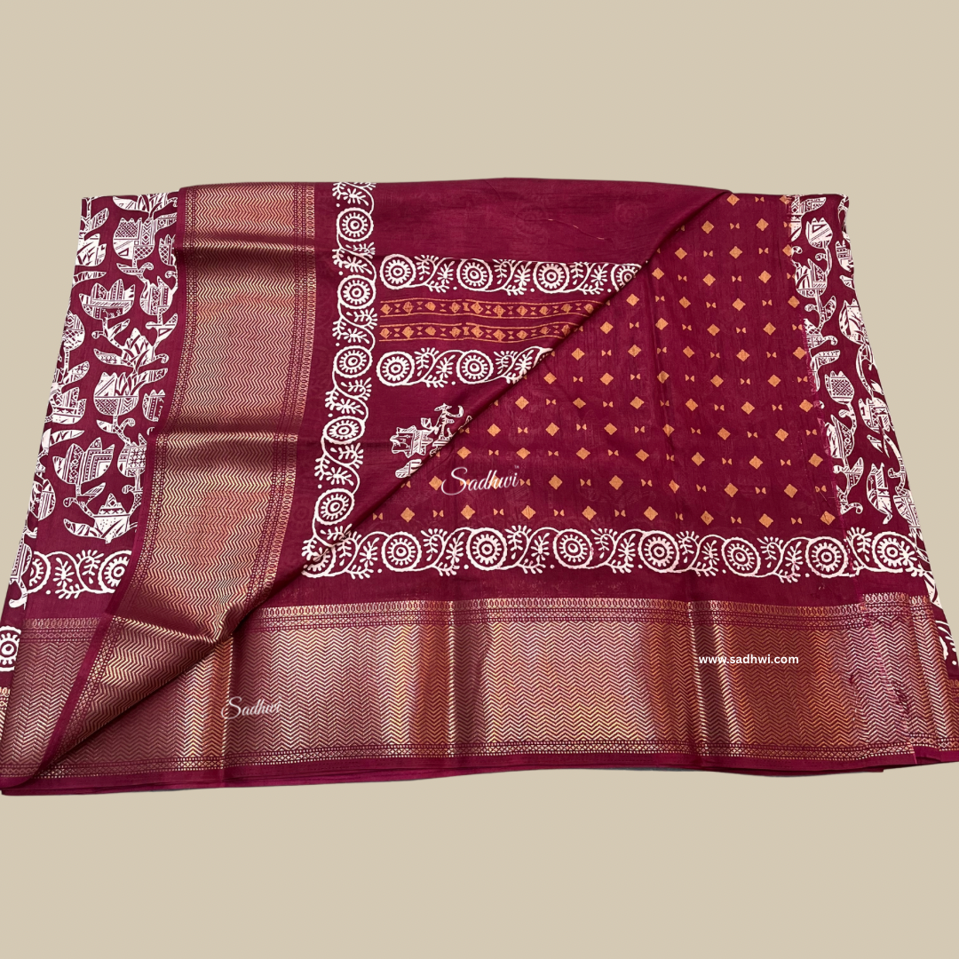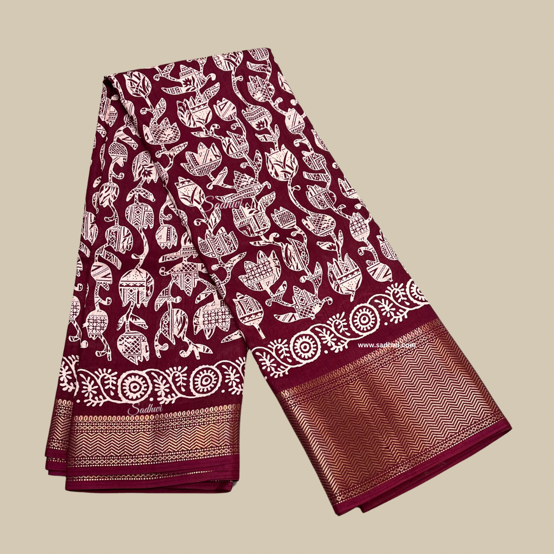 Wine Printed Border Dola Silk Saree