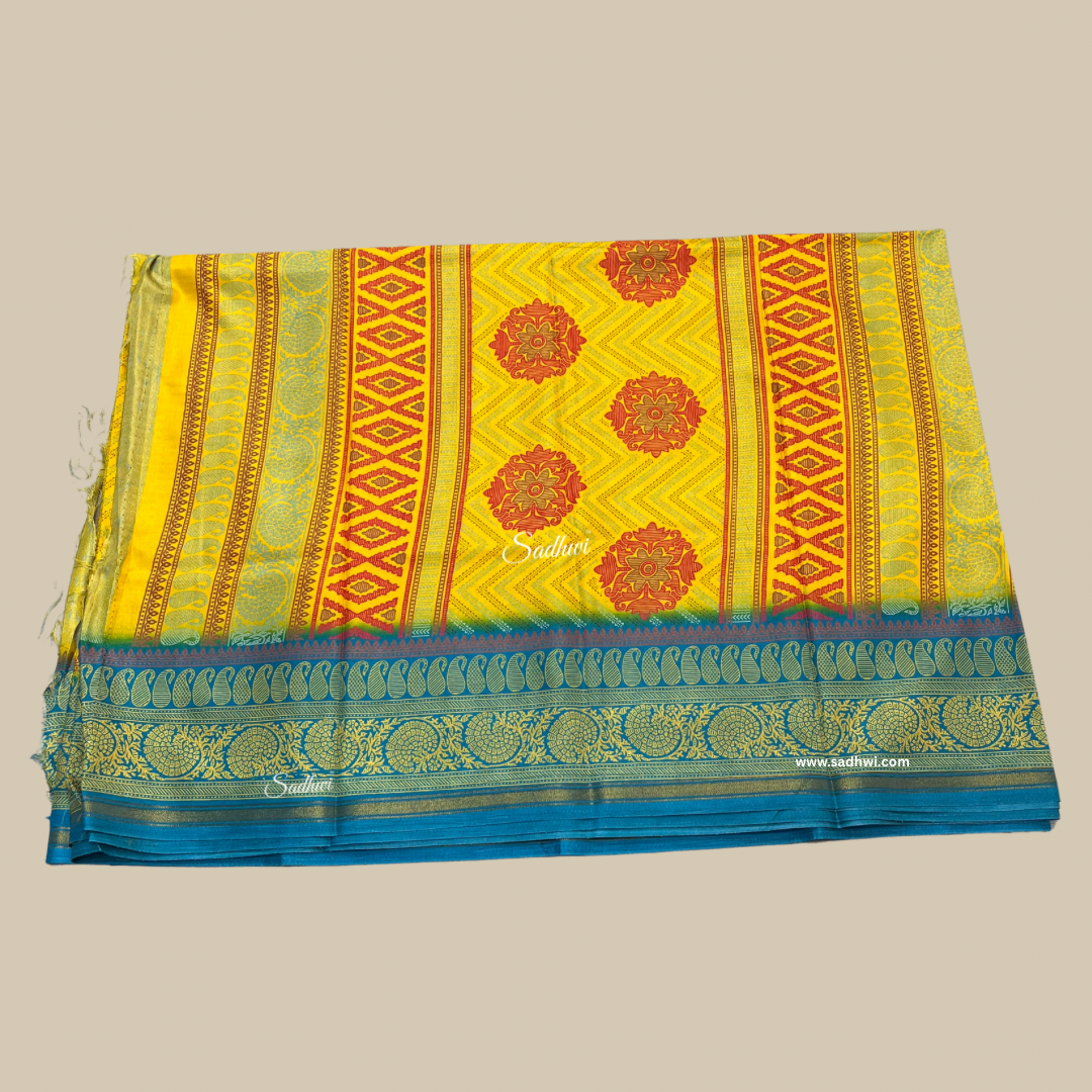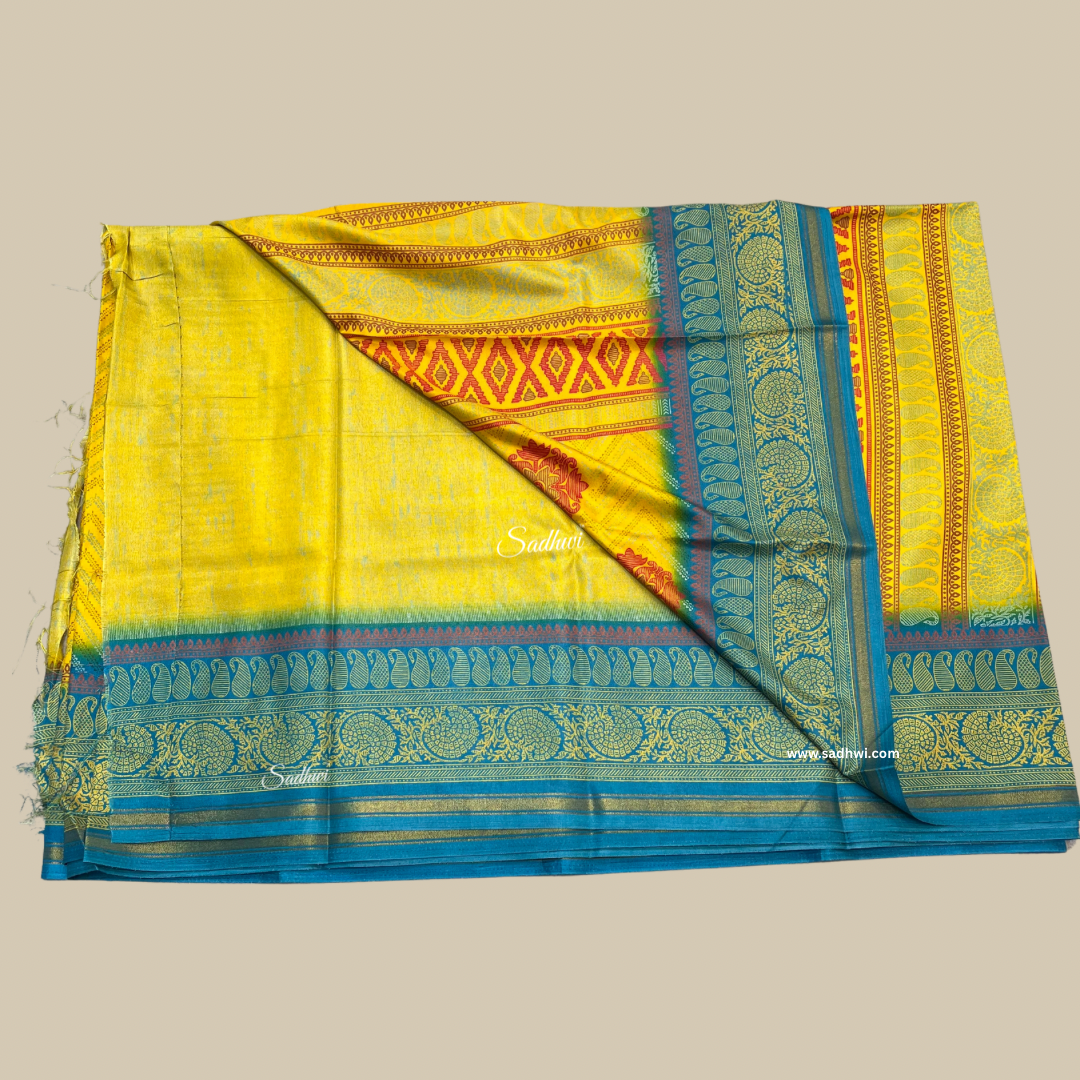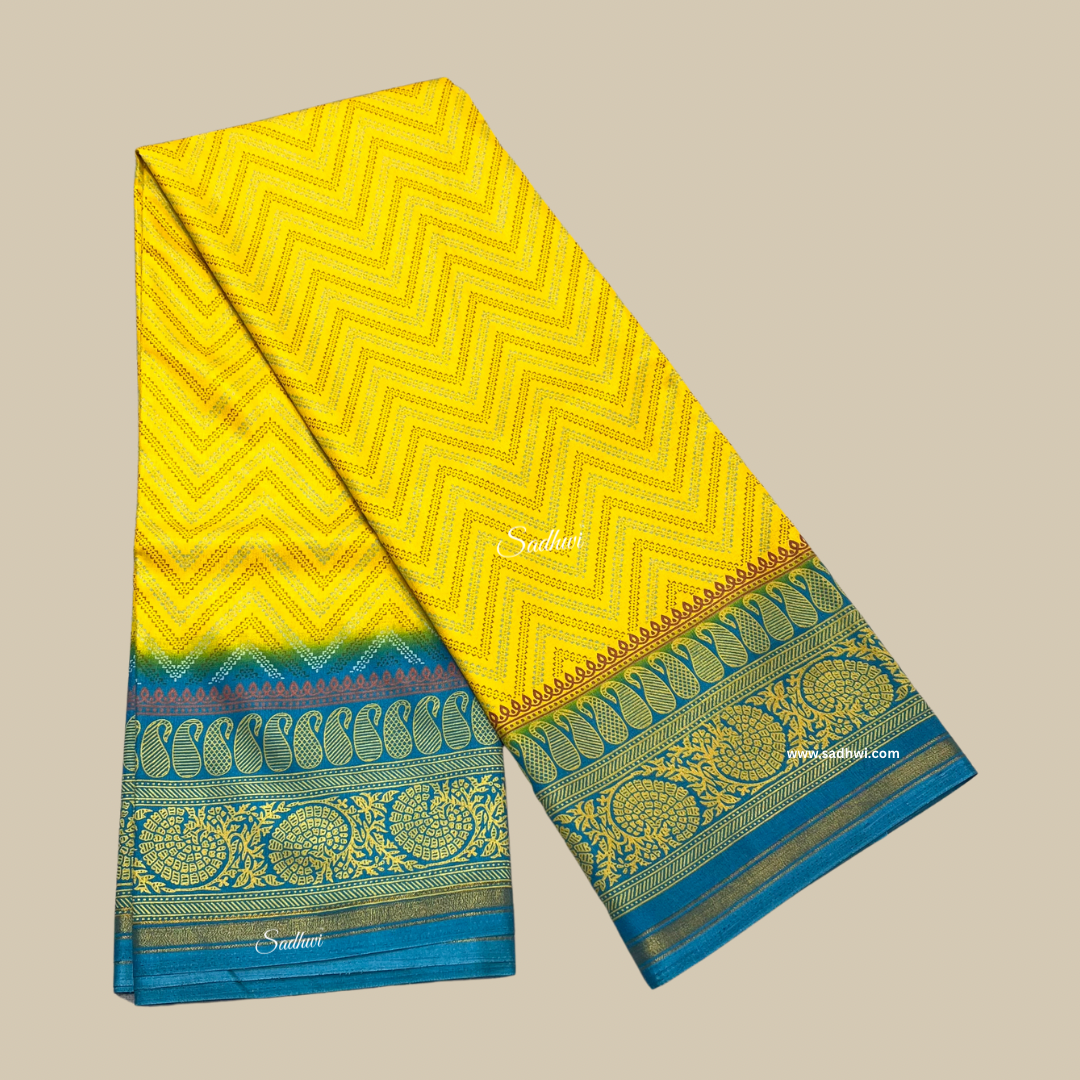 Yellow With Blue Border Printed Crepe Saree