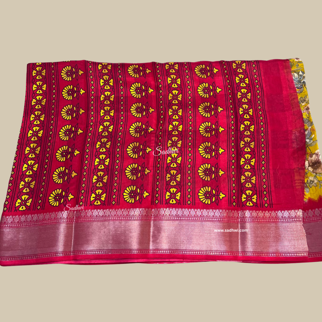 Yellow With Red Border Printed Cotton Silk Saree