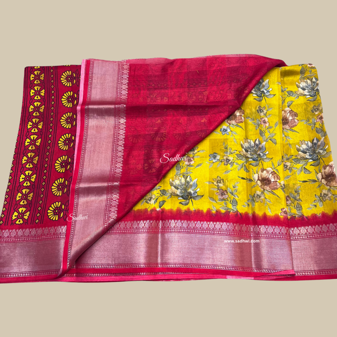 This vibrant yellow cotton silk saree radiates warmth and joy, perfectly balanced by a bold red border that adds a touch of traditional elegance. Adorned with delicate printed motifs, it beautifully blends the softness of cotton with the subtle sheen of silk, offering both comfort and sophistication. Lightweight and graceful, this saree is ideal for festive occasions, cultural events, or everyday elegance. Its timeless color combination and refined finish make it a versatile addition to any wardrobe.